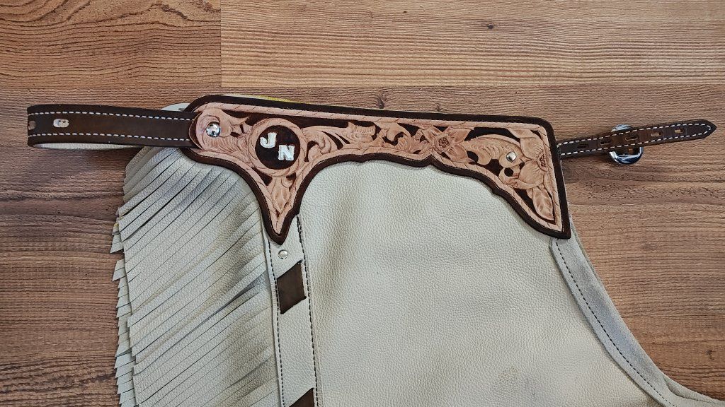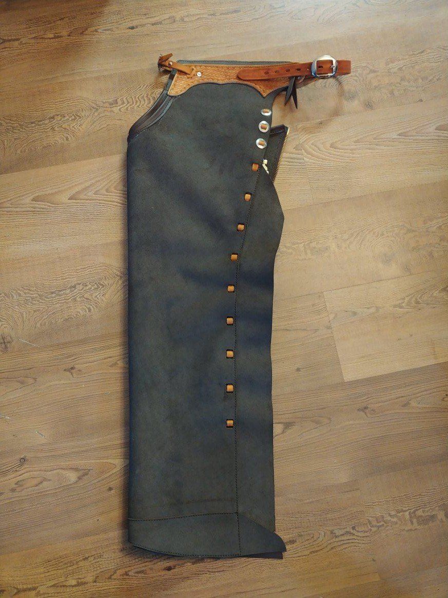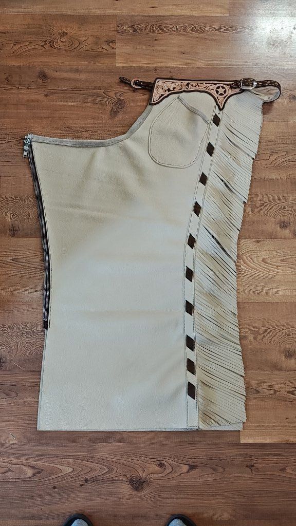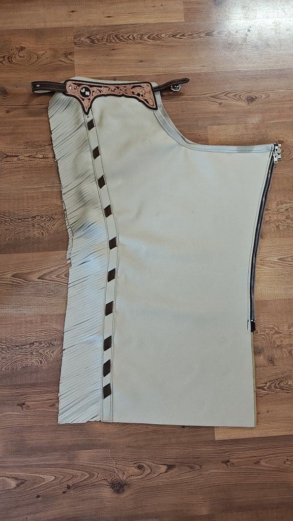 I'll hand make custom chaps, made to fit. Starting at $500 to make a custom pair. Pictured are some that I have done. I can do shotgun chaps, batwing chaps, or any style you have in mind. I will work closely with you to find out the best fit and style for you.