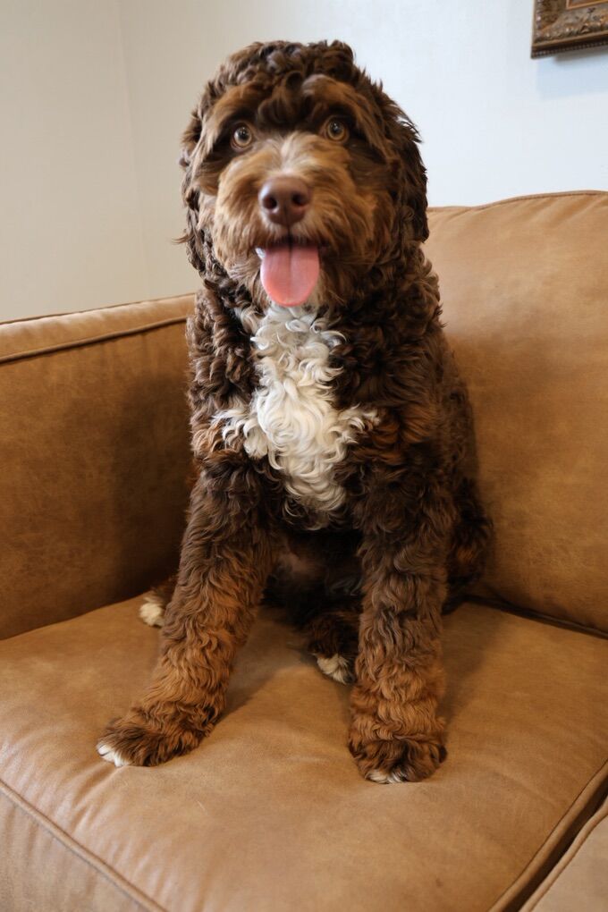 Meet Alabama – a chocolate tricolor Bernedoodle stud with striking rust points and a personality as vibrant as his coat. Born March 31, 2024, Alabama weighs 35 lbs and has already sired two stunning litters. With his unique coloring, excellent structure, and gentle temperament, he’s an exceptional addition to any breeding program.