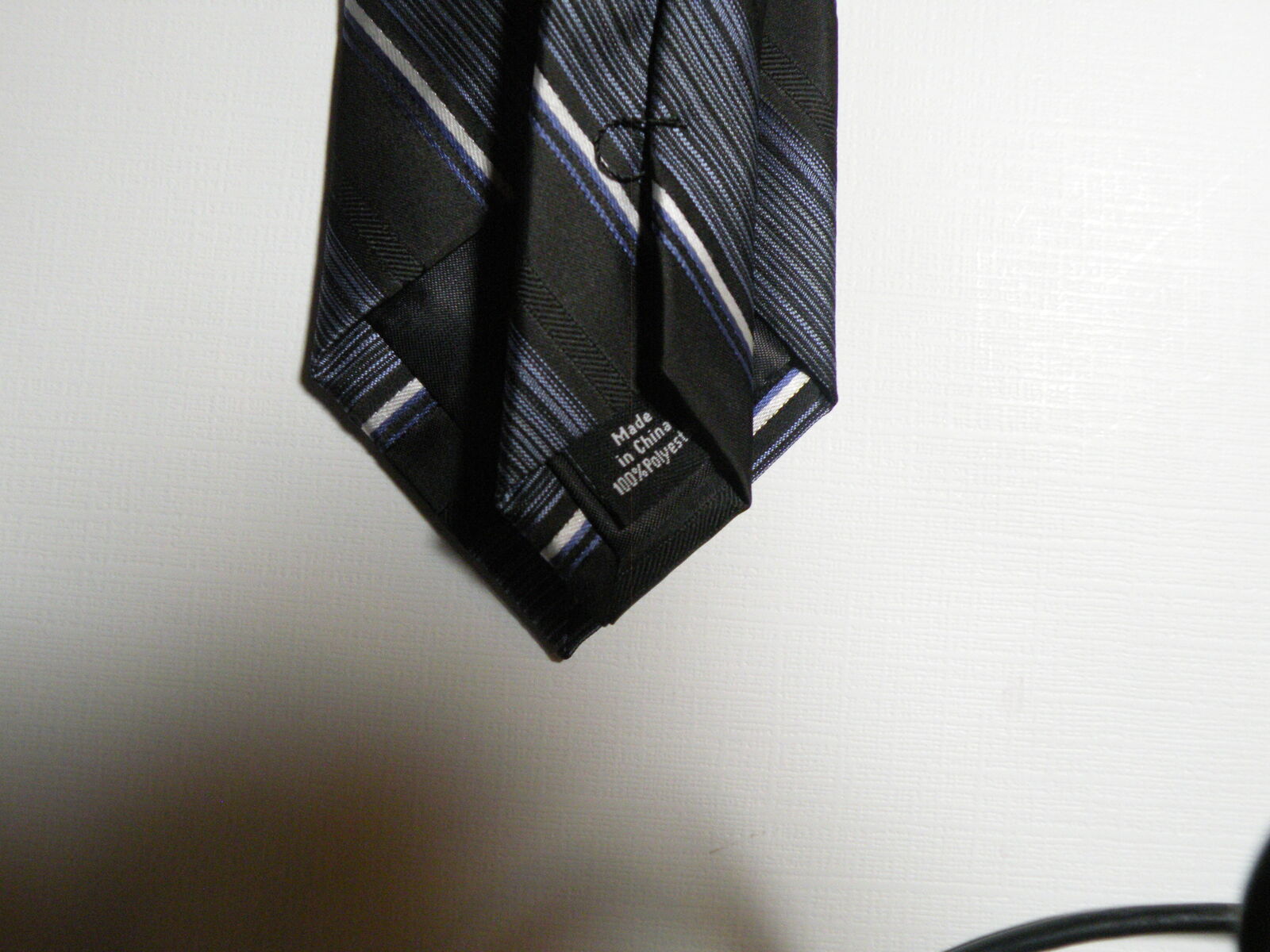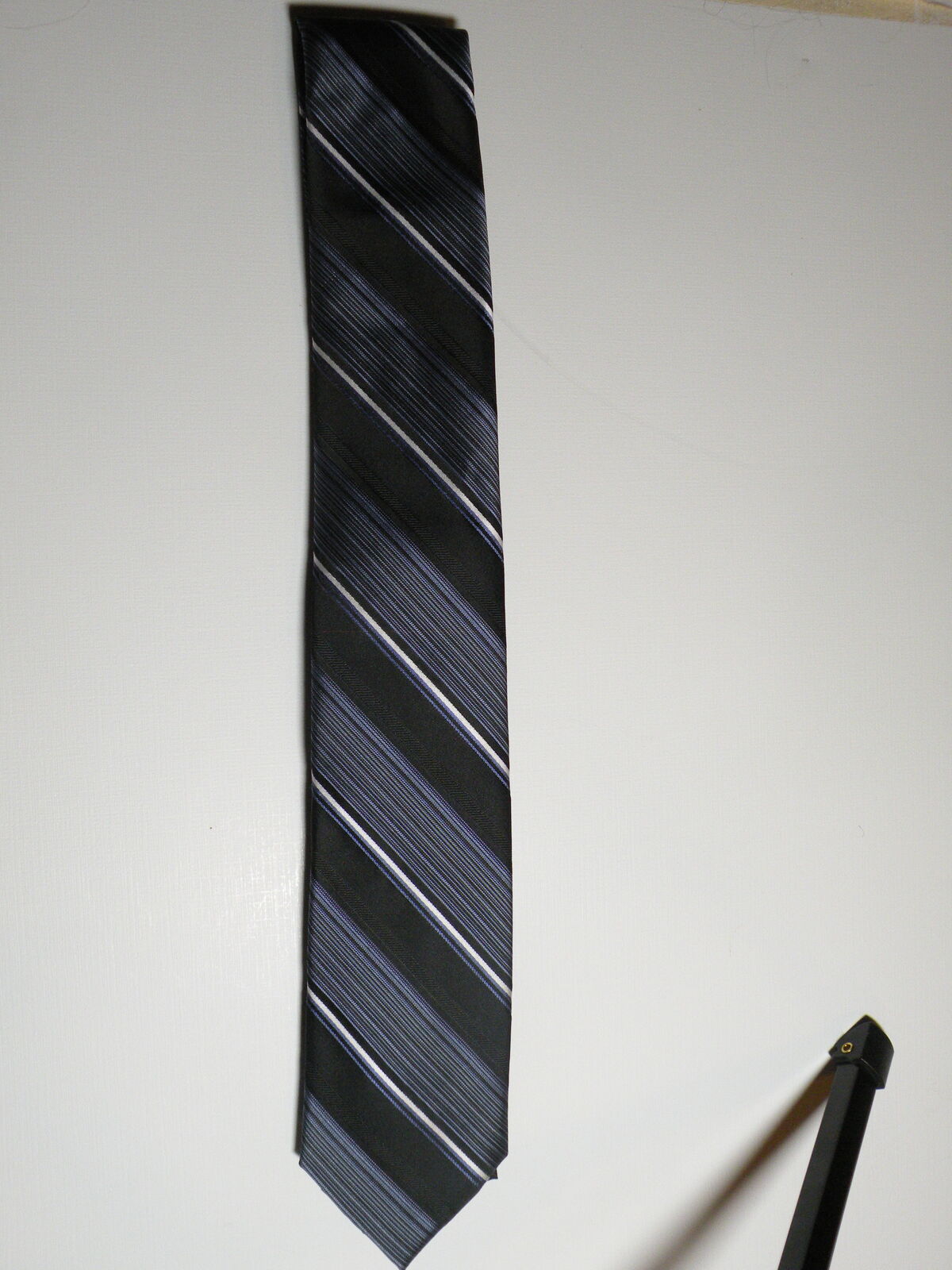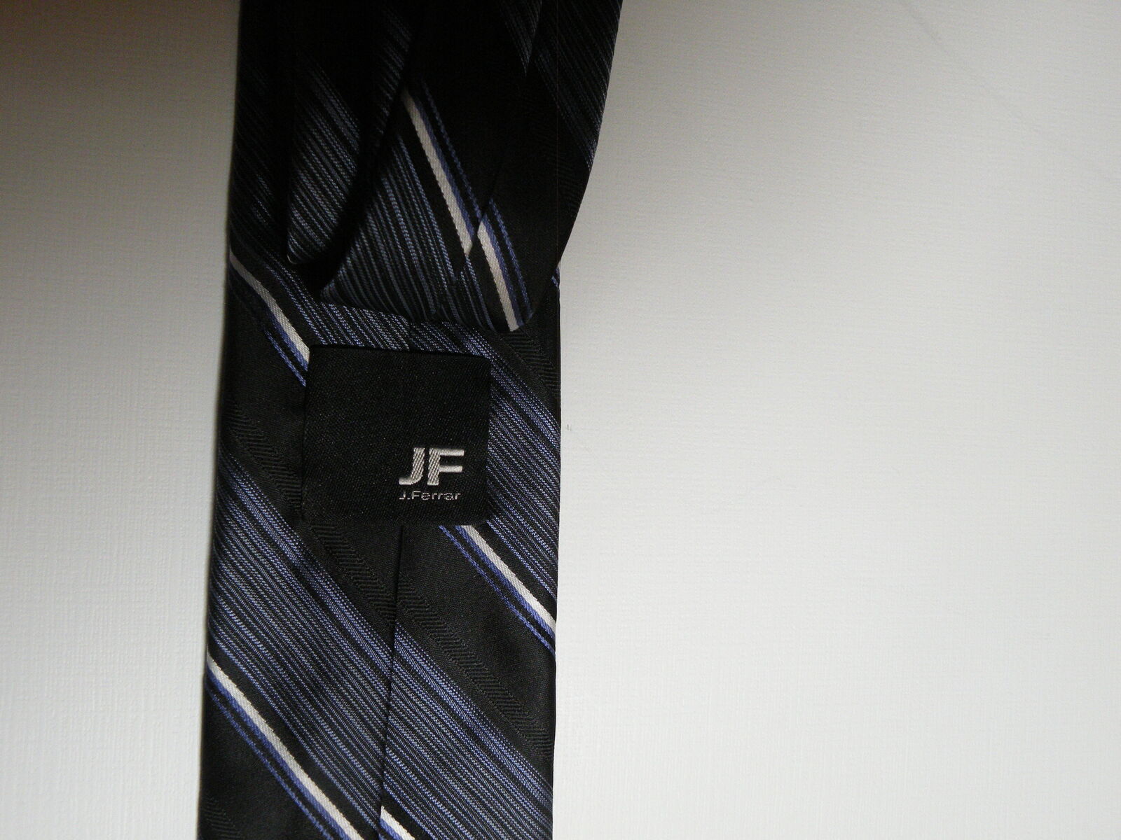 J. Ferrar 100% Polyester Tie with Blue Purple White and Black Diagonal Stripes in excellent condition. Regular length.