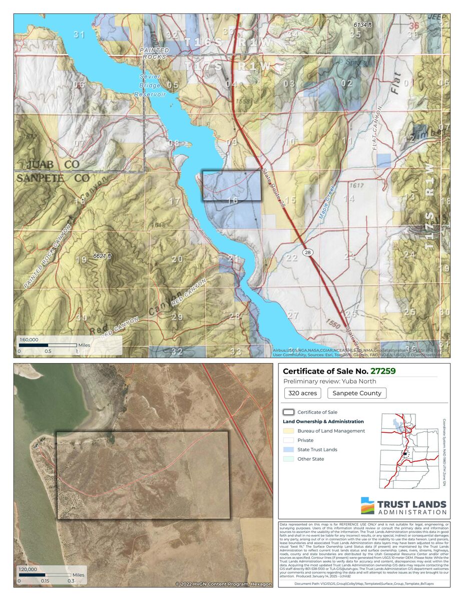 Utah Trust Lands Administration is selling a 320-acre property, located next to Yuba Reservoir, at a future land sale auction. The minimum starting bid is $1,349,300. Financing is available. For more information, call (801) 538-5163 or visit trustlands.utah.gov. (C-27259)