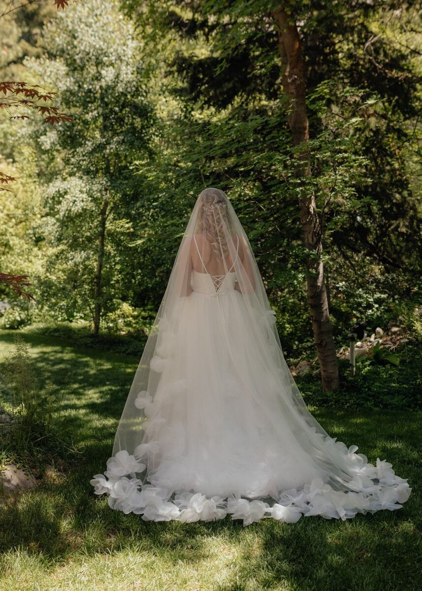 GooglePay3D Big Floral Veil, Drop Long Flowered Wedding veil, chapel off-white bridal veil with 3D effect petal , blusher flowers long veil