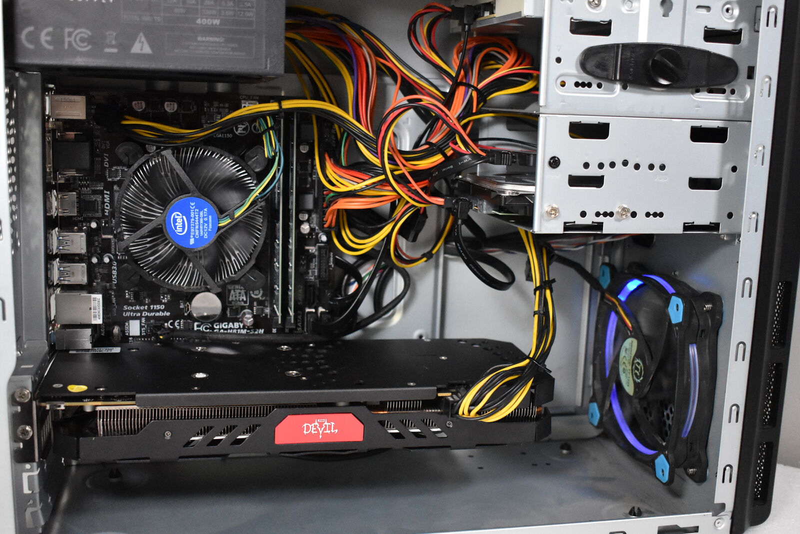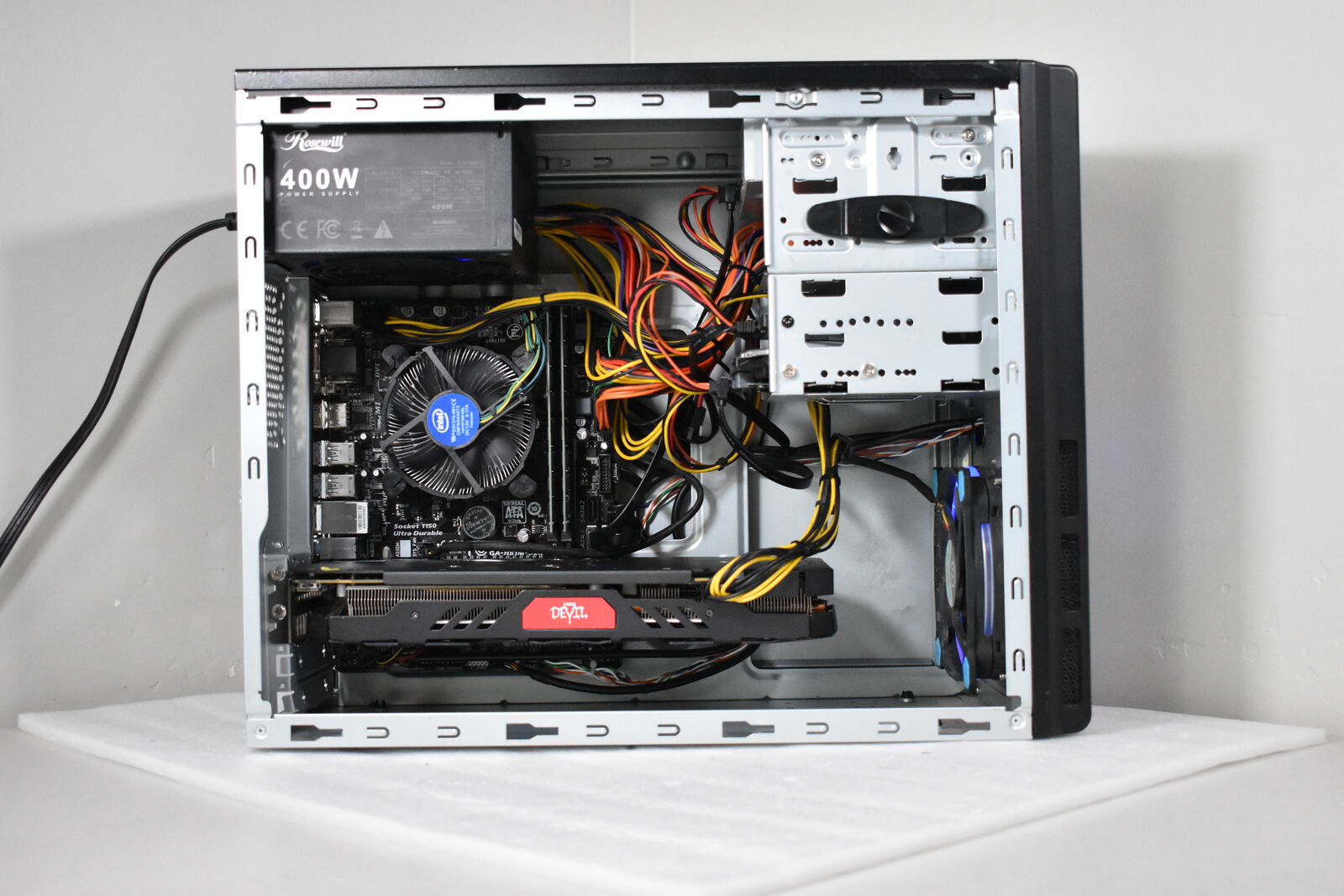 Case: Black CoolerMaster Mid Tower Case! This case comes with 2x Fans. Case has a few slight dents on the top.