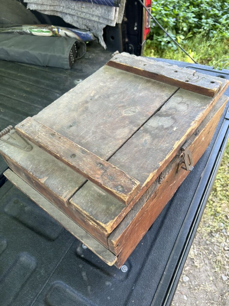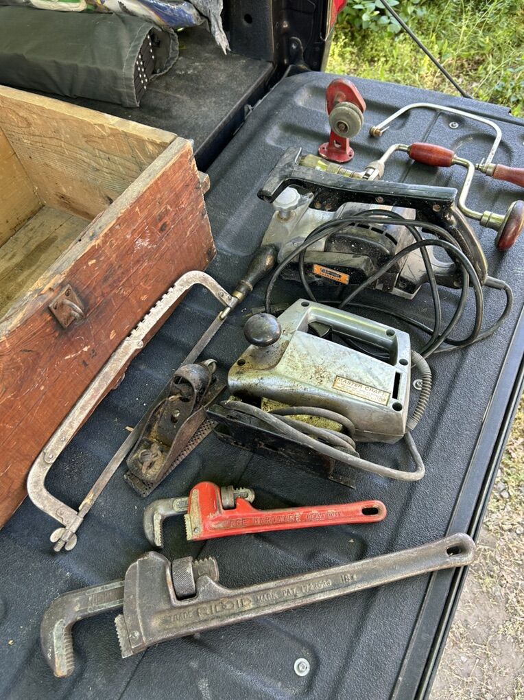 VenmoThis is a super old antique wooden box filled with vintage hand and power tools. Includes a power planer, power saber saw, hack saw, hand drill, a couple pipe wrenches, hand planer, coping saw (no blade), and some weird little red thing which I cannot identify.
