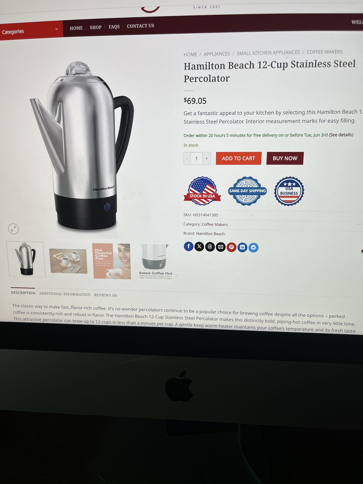 Hamilton Beach 12-Cup Stainless Steel Percolator-Coffee Pot.