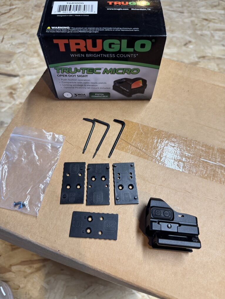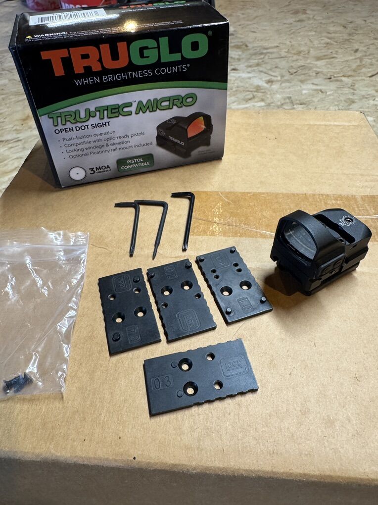 TruGlow micro 3-MOA Green dot kit. Had it mounted and used on my Glock-19 held zero every time. It does come with rail mount as well so you can tilt shoot/close quarters shoot if you’d like. Has 4 pistol mount plates. I paid $218 for it about a year ago. - $175