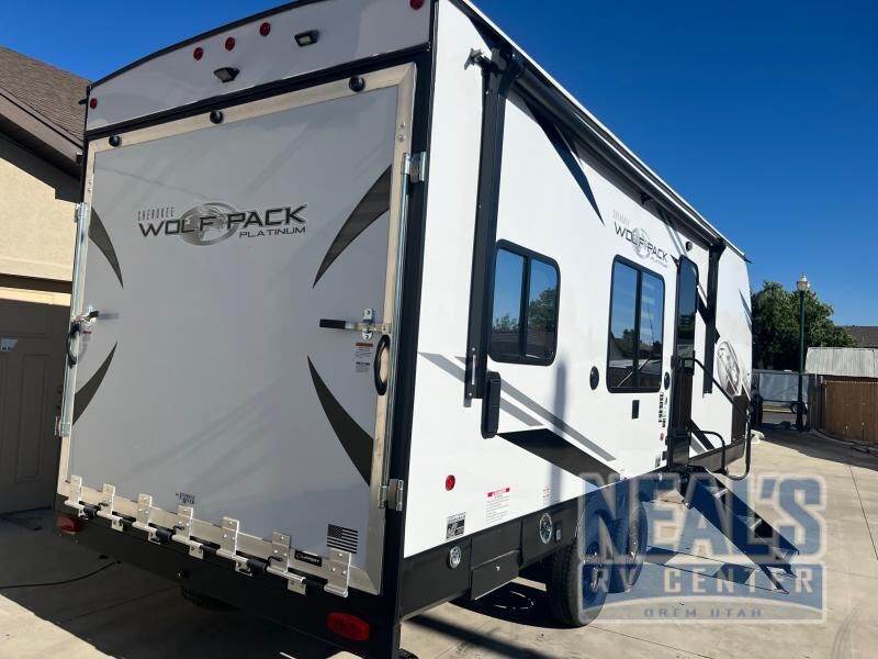 With any Cherokee Wolf Pack by Forest River, you will enjoy the most affordable and versatile toy hauler on the market! These fifth wheels and travel trailers feature an 8' 6" widebody design so you can bring along four-wheelers, kayak's, ATV's, golf carts, and gear galore! There is a forced air heated underbelly and enclosed holding tanks, plus a large 35,000 BTU forced air ducted furnace so you can camp all year around. Inside, you'll find zebra shades in the living room, real wood cabinet doors and drawers, LED lights, and a residential stainless steel farm sink. There is also a power awning with LED accent lighting, a large exterior folding grab handle, and an outside shower with hot and cold water to wash off your riding boots. There are also select features available within the Platinum Package and options that can be added to further customize your Cherokee Wolf Pack!