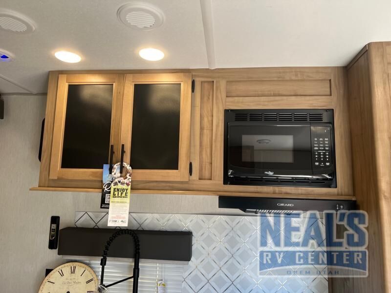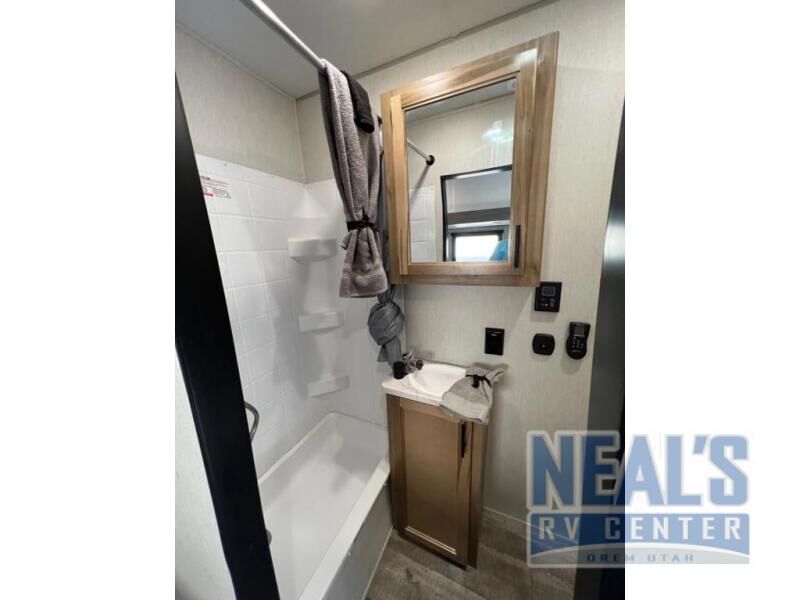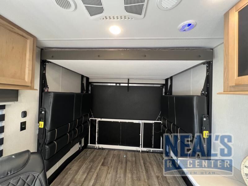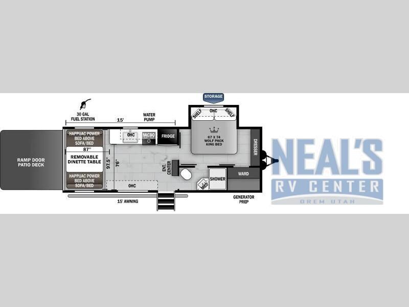 Are you wanting to explore the great outdoors with your toys, but don't want to leave creature comforts at home? If so, you need this toy hauler that comes in under 30 feet long! You'll enjoy 15' total garage space when you utilize the space through the kitchen. Your guest can sleep on the Happijac power bed above the sofa/bed, and there is a removable dinette table where everyone can dine at each morning. Up front you'll find the private bedroom on one side, and the dual entry bath on the other side. A Wolf Pack king bed with shelves will allow you to sleep like royalty each night, and nighttime restroom breaks will be easier than ever!