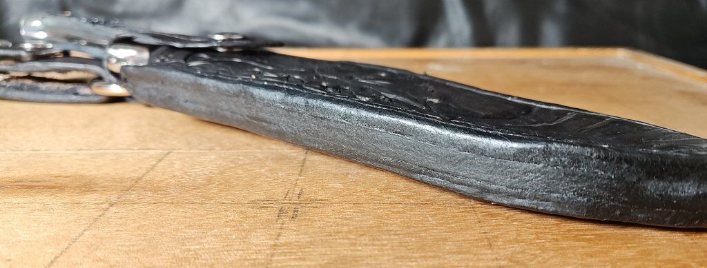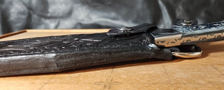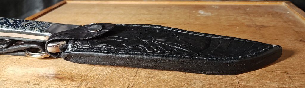 Custom made, hand carved, heavy duty. Has a snap of the belt loop. There's a ring that connects the belt loop to the sheath which allows for the knife to swing and move. Any questions please text. Asking $75 OBO for the sheath.