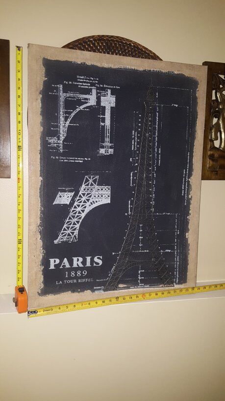 Decorative canvas featuring Eiffel Tower blueprint design in metal