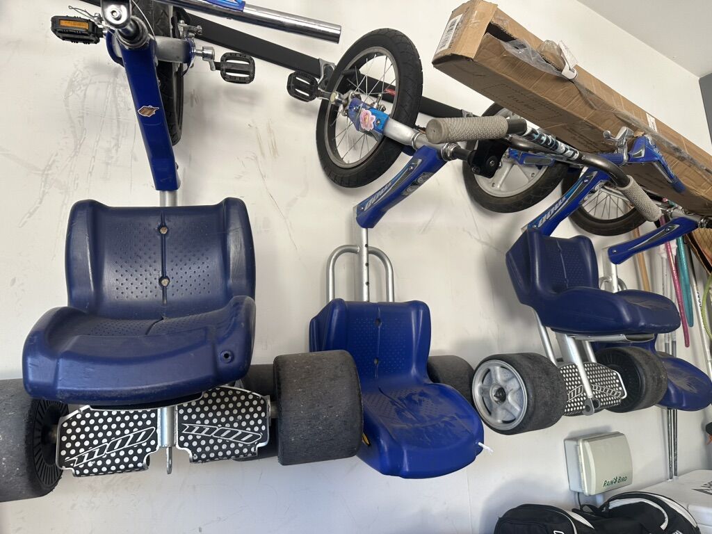 ZelleTrek MOD drift trike, a unique and rare find for enthusiasts and collectors alike. This trike features a sturdy steel frame, adjustable seating, and a front hand brake, designed for thrilling drifting experiences. The rear wheels are equipped with hard plastic sleeves, perfect for smooth slides and controlled drifts.