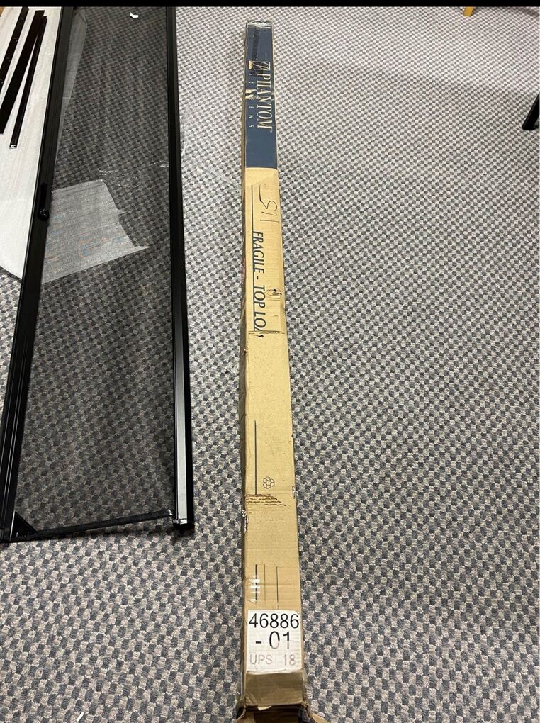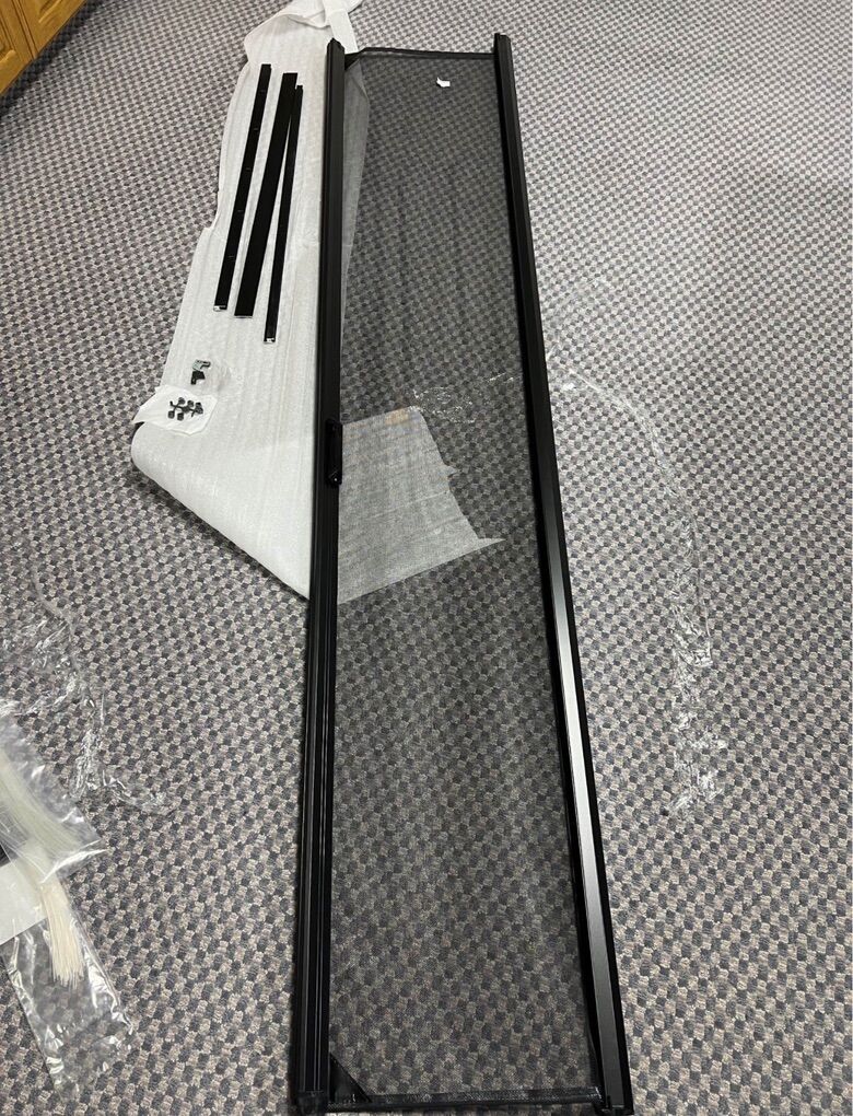 VenmoPhantom Screens retractable door screen with dimensions 96 inches high by 36 inches wide, black. It fits a door whose hinges are on the left when you look at it from inside.