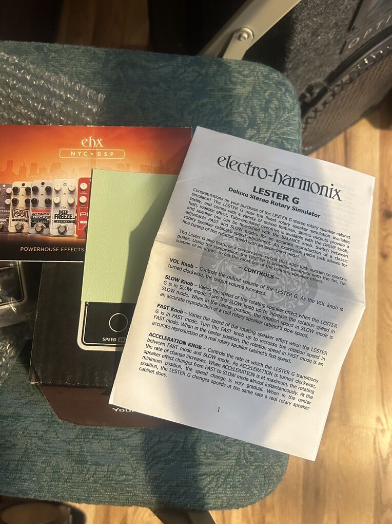 Lester G Rotary Speaker pedal used once, still in box with paperwork and power cord, these sell on Amazon and Sweetwater for $272 and used on Reverb for around $200