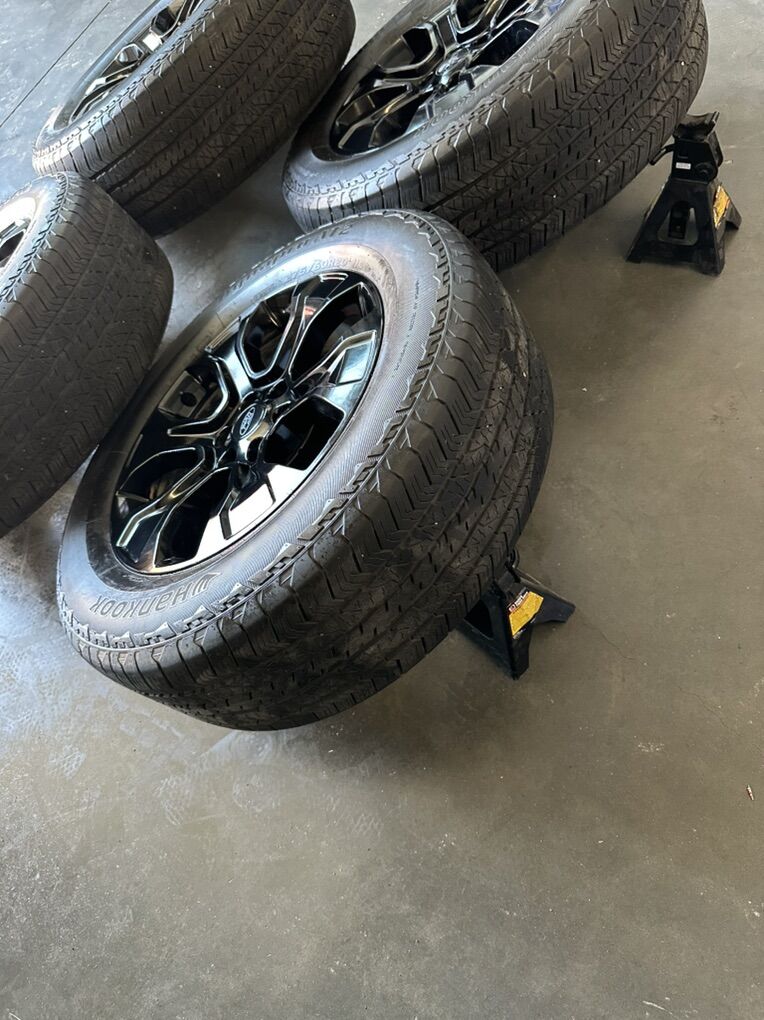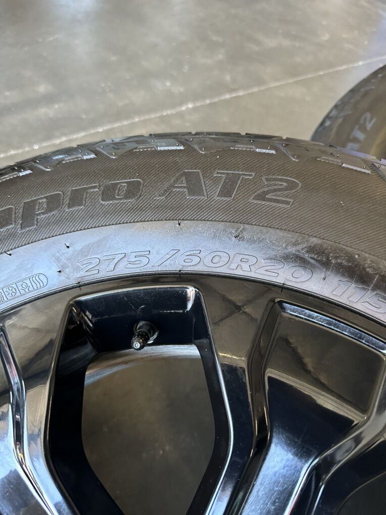 275/65r20 Hankook dynapro AT2 tires, these tires are free from any patches or plugs, no uneven wearing, no sidewall damages. These tires have a great bit of tread remaining. This set up is complete and ready to go, today!
