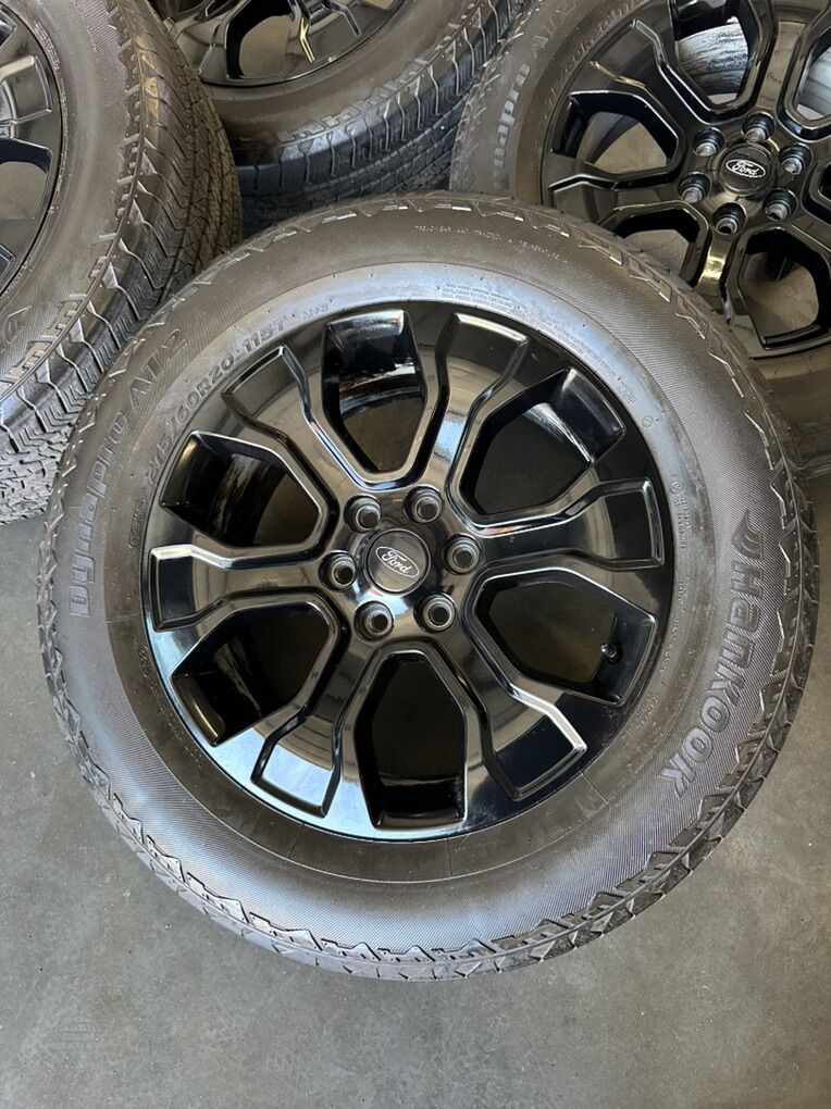 2024 Ford F150 20” blackout packaged wheels wrapped around a 275/65r20 Hankook Dynapro AT2 tire. Set up is in good shape with a good tread!