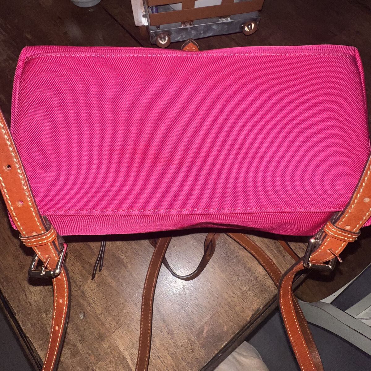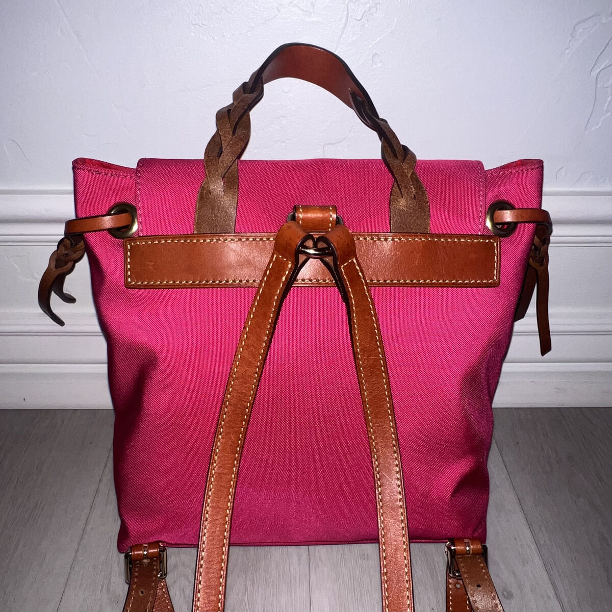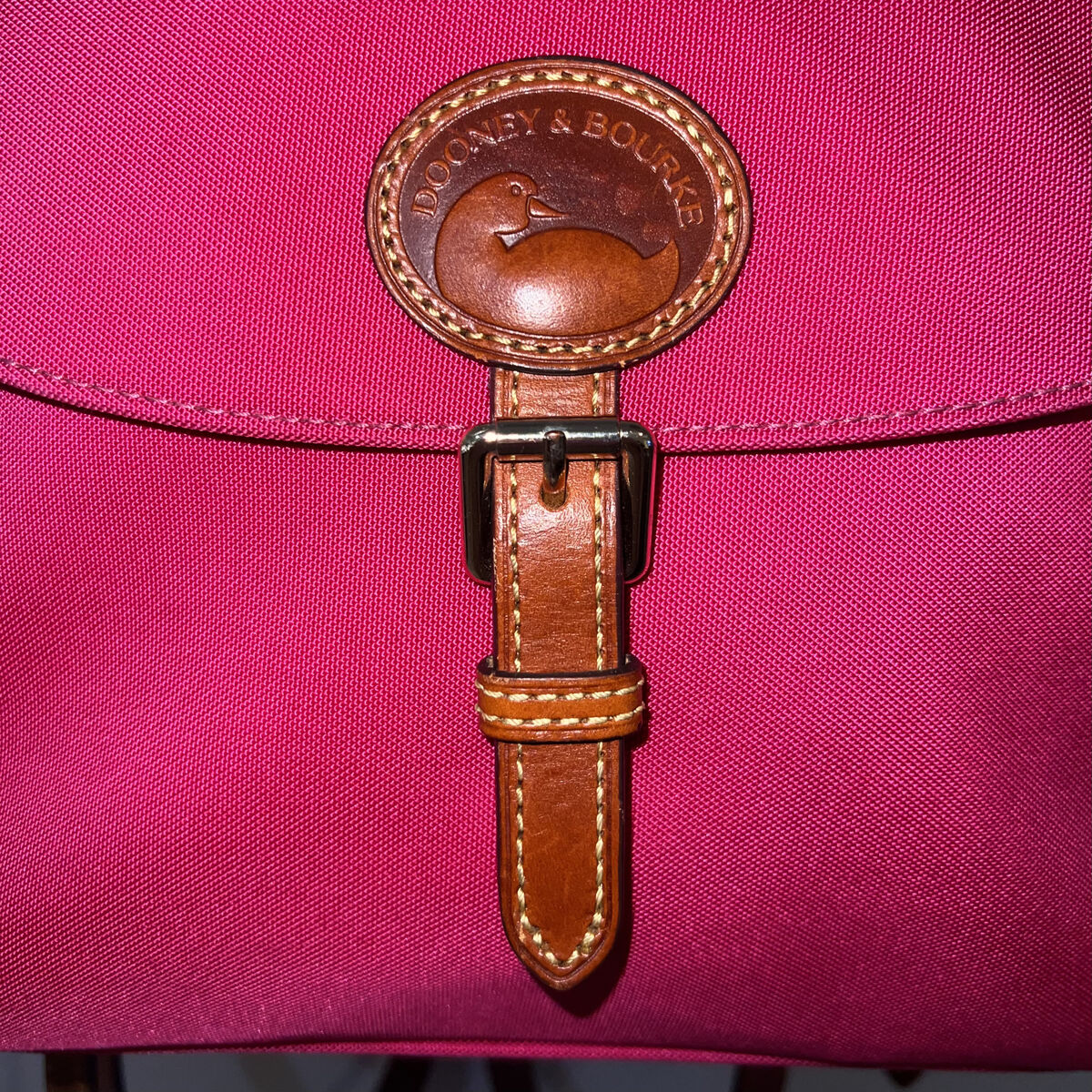 VenmoThis Dooney & Bourke Nylon Flap Backpack Bag is in like new condition. Very hard to find in PINK! I only used it once, and it's been in my closet since. I have too many bags and must downsize. Originally $288 when new, I bought it on sale for $138. Pink is no longer available. Only a couple of things to mention... the magnetic metal back snap has slight scuffing from the top snap making contact when opening/closing - normal for a magnetic closure. The bottom of the bag has slight marks that I haven't tried to get out. Looks like a watermark. I added a pic, but it's hard to see in photos.
