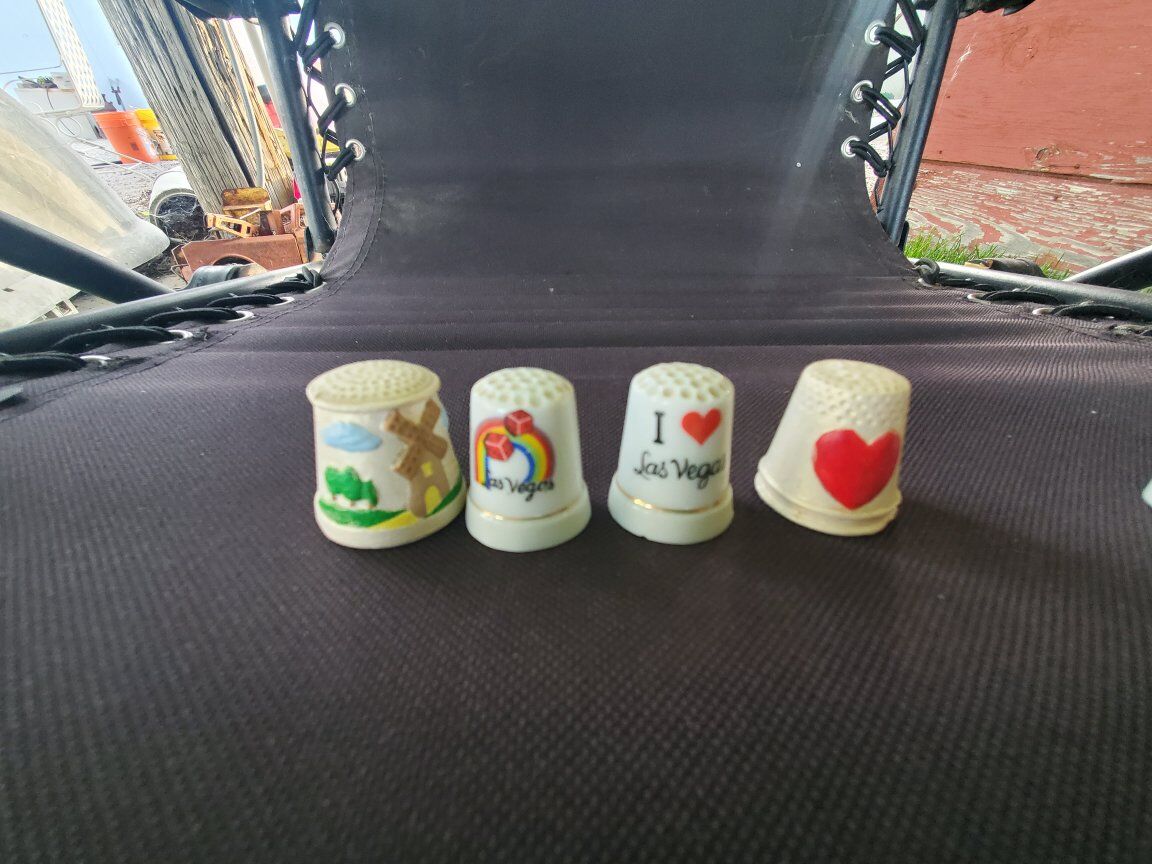 I have 19 thimbles for sale and a wooden display. 1.00 each on the thimbles and 5 for the display. 10.00 for all of it if you buy it all!!! CASH ONLY