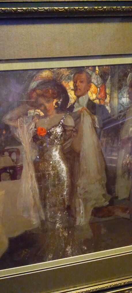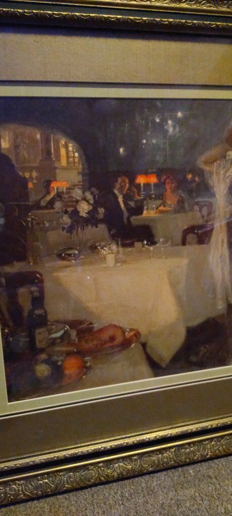 Really nice is this Beautiful classy style portrait size print in a elegant gold Gilt frame and is titled-In the restaurant by Charles Hoffbauer and is approximately 41" wide x 32"Tall and is in pristine condition