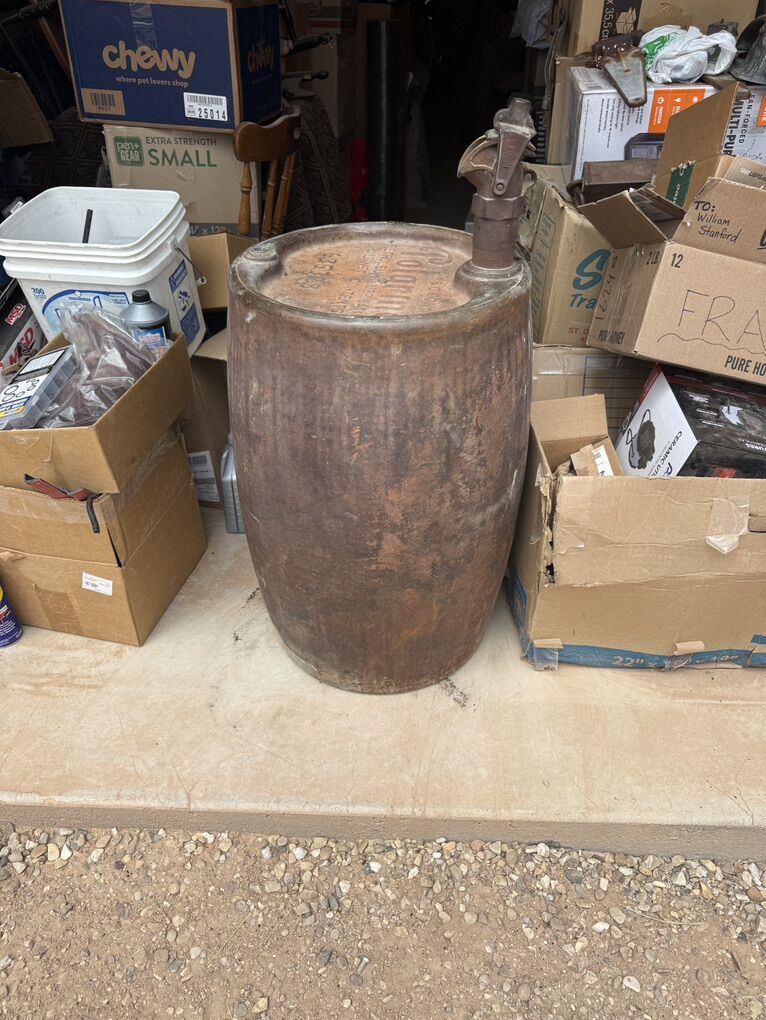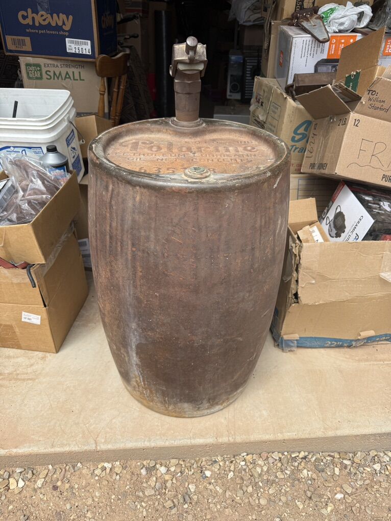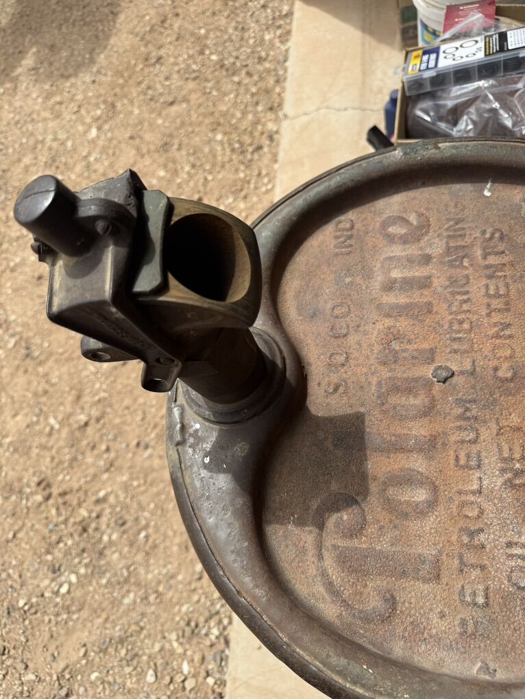 ApplePayAntique Polarine Petroleum barrel. Top is Brass. Decorative with functioning spout. Have used it to set my saddle on.