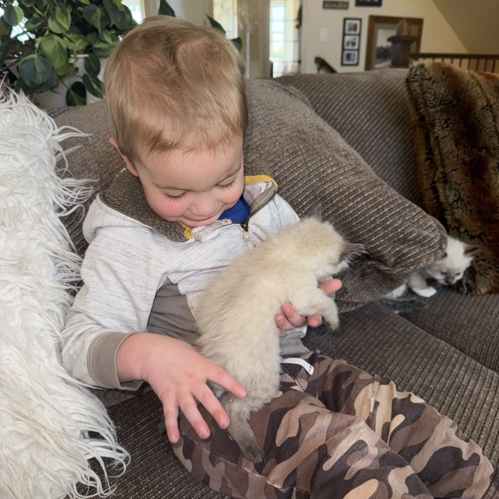 Unlike most Utah Ragdolls (evolving genitically larger in Utah over the years), many Ragdolls in Utah are reaching 25–35 lbs, ours stay small, about one-quarter that size. Our's with gentically smaller builds makes them easier to hold, carry, and snuggle under our necks (their favorite place to be along with laps), while still living long, healthy lives.