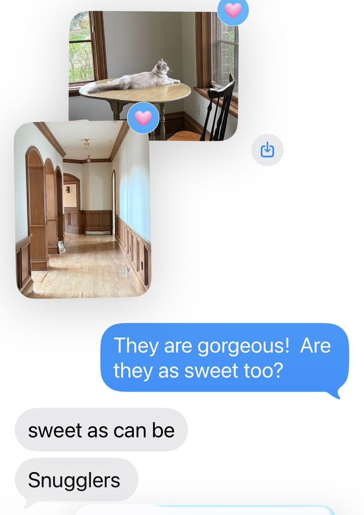 **Our kittens are EXTREMELY AFFECTIONATE, healthy, playful, and intelligent—they talk, fetch, leash-train, and even do tricks (**we can send videos!) They are incredibly loyal and cuddly, following you everywhere like little dogs. **One of our 1st male Ragdolls (from Ann Baker's Cattery--ORIGINAL RAGDOLL BREEDER in California) walked our children to the bus stop daily and was there at the bus stop to walk them home (we had a kitty door and he met them on his own daily).