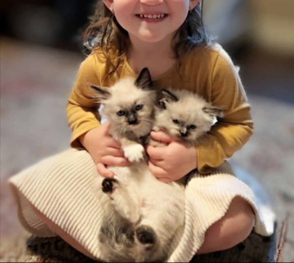 Our parents are both smaller gorgeous beauties! Our smaller 4 pound TICA REGISTERED & PAPERED RARE Bi-Color Lilac mom (pics 7 & 8) along with Pevency, our sought after handsome PUREBRED RAGDOLL stud, less than 7 lbs (Blue Lynx Mitted Mink pics #2-5--both parents TICA Registered & Papered) together produce BEAUTIFUL, boutique-quality kittens with famous loyal puppy/doglike affectionate temperaments. STUNNING kittens w/ super fluffy coats and GORGEOUS BBRIGHT BLUE EYES & famous loyal PUPPY DOG FLOP on your lap RAGDOLL temperament ours are famous for.*****