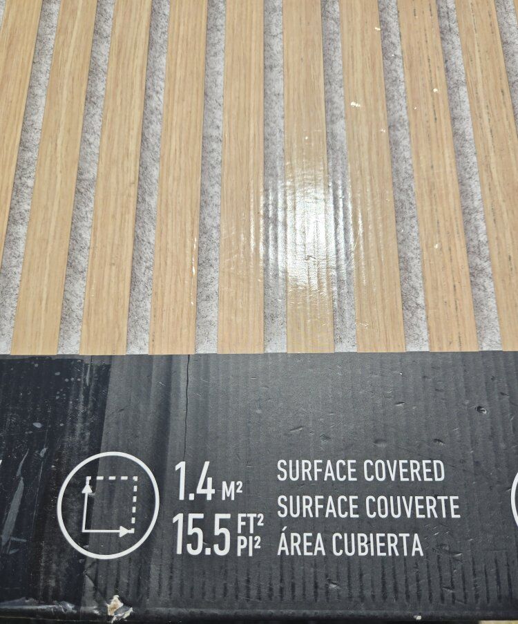 Pack of 4 sound-absorbing slatted panel kit. Oak and gray color. New still in box