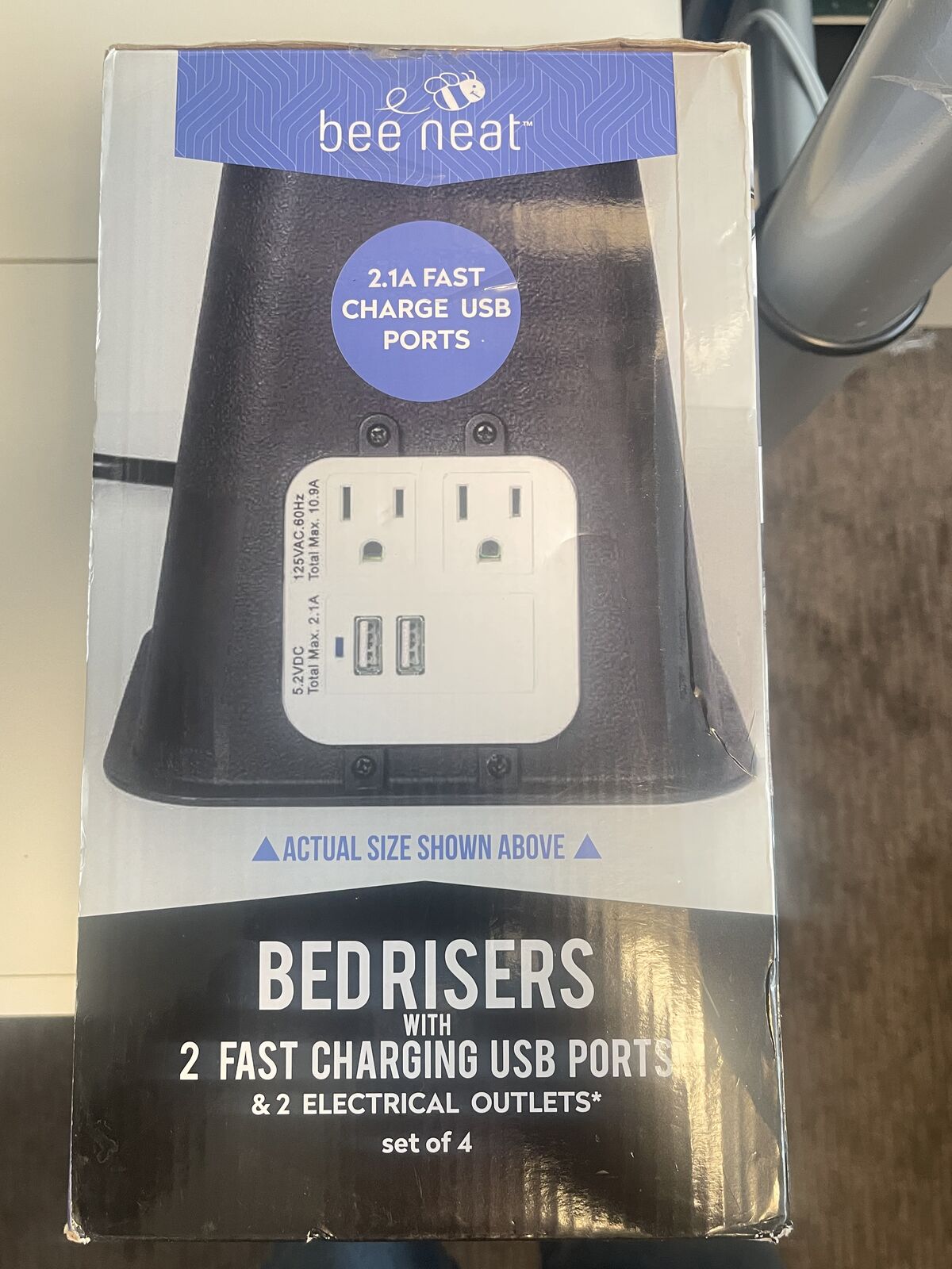 Four risers per package with convenient electic outlets and USB ports. Easily increase bed frame height for under-the-bed storage.