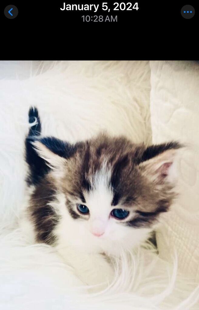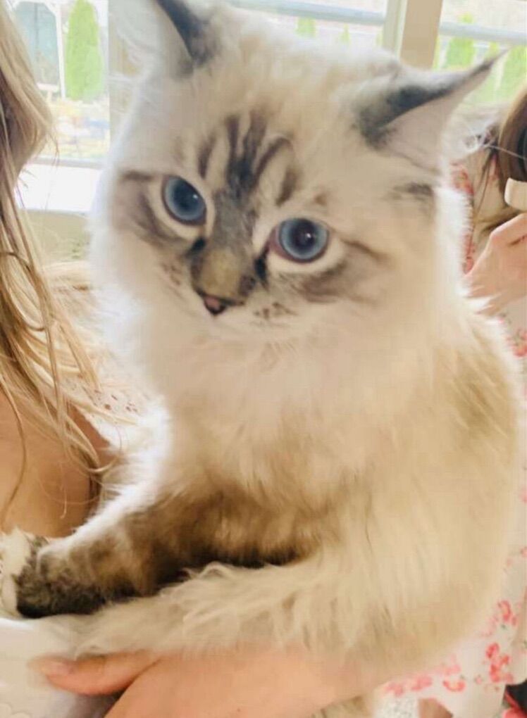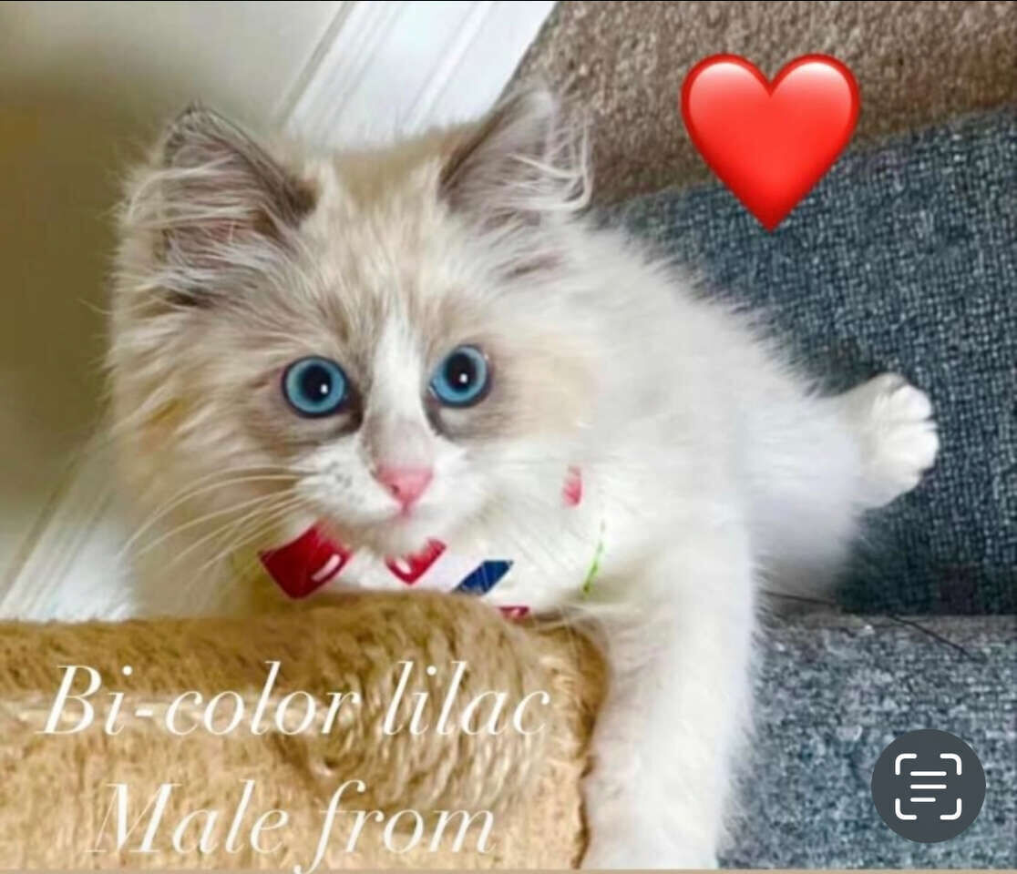 Picture #6 is one of our kittens now an adult (a Blue Lynx female a family bought a year ago). Same family then called wanting 2 more--flew in from California where they are 5K each and flew back with 2 more half priced kittens the same day! What always happens (most buy 2 or more)--love our pictures & feedback! (we care!) Last pic was was from our buyer she posted on FB from a couple who bought a flame bi-color from our purebred papered TICA Lilac bi-color 2 years ago (same father: our stud Pevency always)--they do love their kitty (feedback we get from all our buyers)!