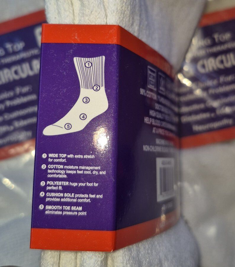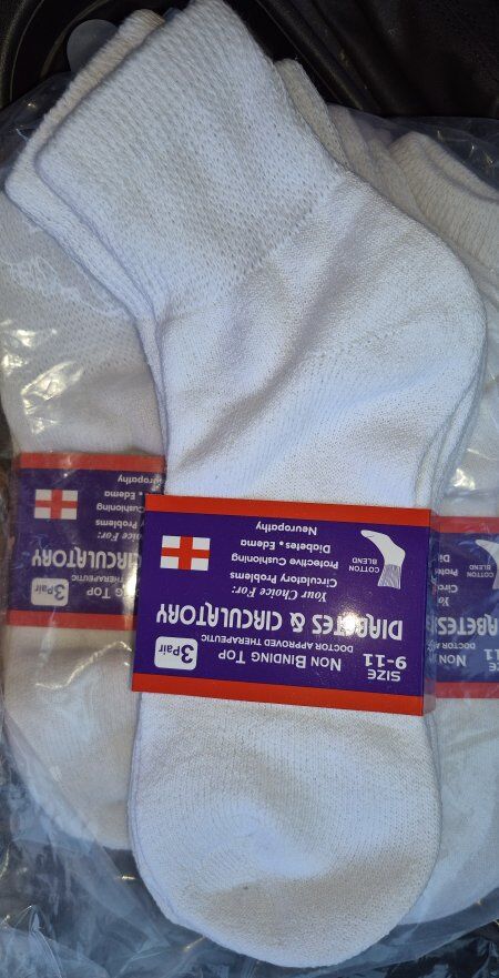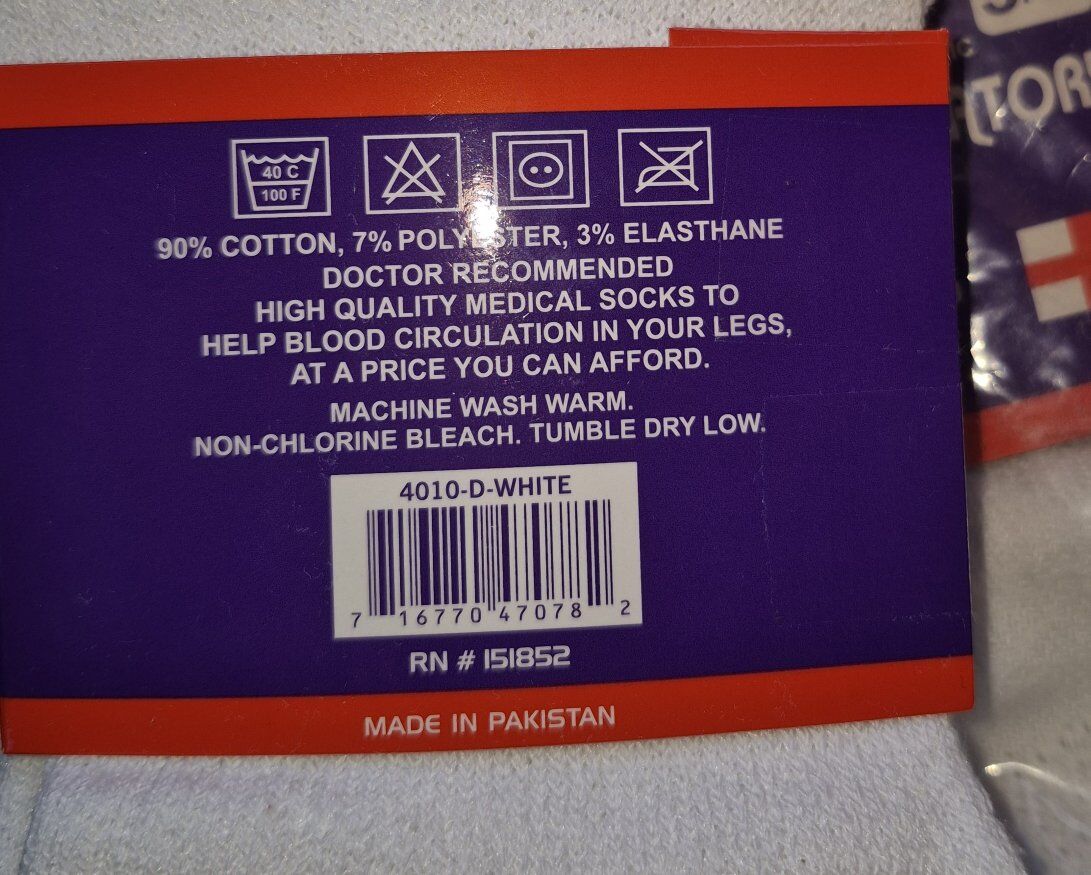 Diabetic Ankle Socks 3-pack White Ankle Quarter size 9-11 Men's 90% Cotton, 7% Polyester, 3% Elastane Made In Pakistan Non-Binding Circulatory DOCTOR RECOMMENDED HIGH QUALITY MEDICAL SOCKS TO HELP BLOOD CIRCULATION IN YOUR LEGS MACHINE WASH WARM. NON-CHLORINE BLEACH. TUMBLE DRY LOW.