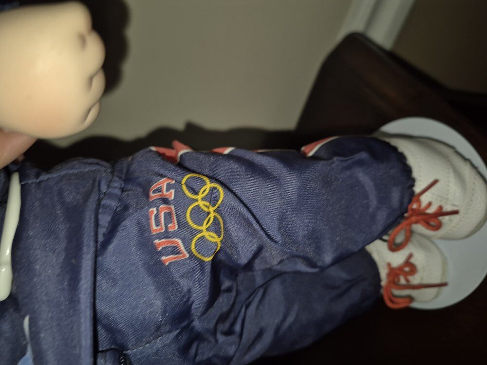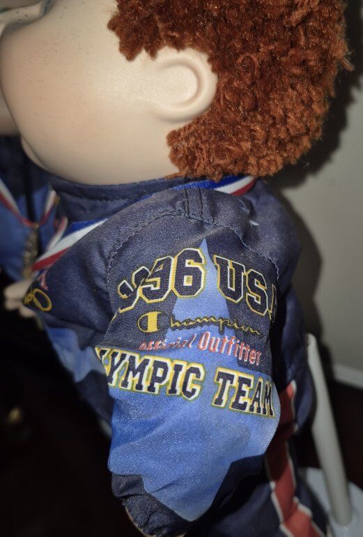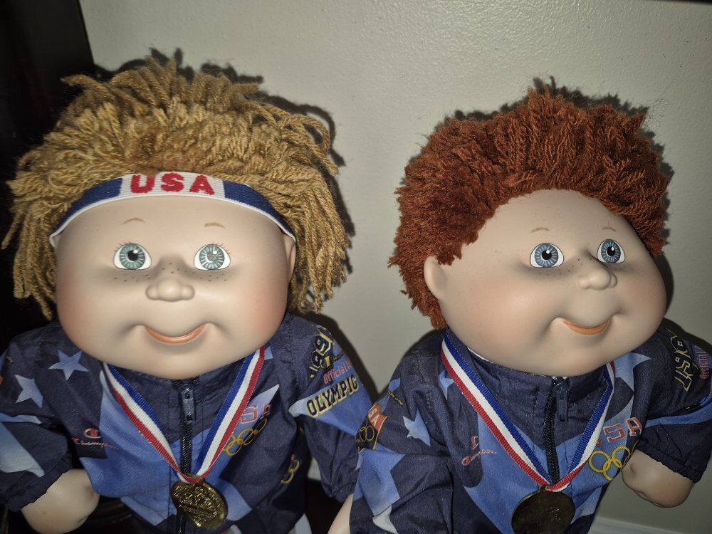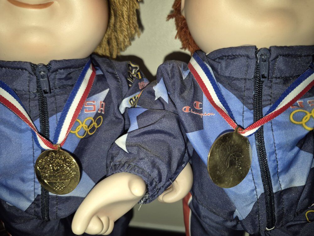 Cabbage Patch Kids Olympikids Special Edition dolls from 1996, designed as mascots for the U.S. Olympic team. Pre-owned with bases in a never-played-with Mint condition! Special Edition: These dolls were part of a special series celebrating the 1996 Olympics. Gymnastics Theme: The dolls are dressed in gymnastics outfits, complete with medals. Collectible: As part of the first run of Cabbage Patch Kids, these dolls are considered valuable by collectors, especially in mint condition. Unique Design: Each doll has a unique look, with different hair colors (blonde and red) and Champion Brand outfits.