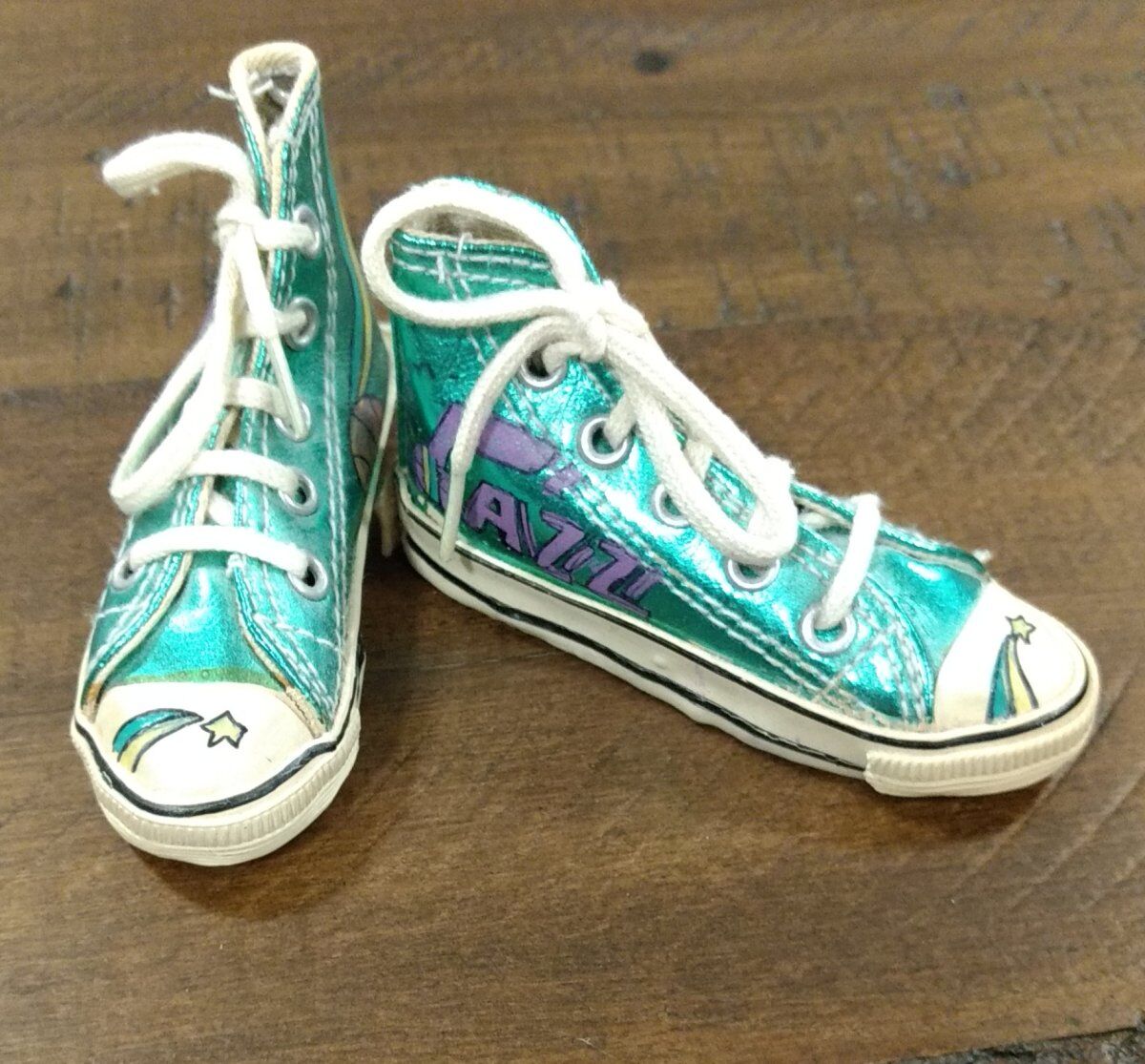 This is a pair of miniature Utah Jazz basketball shoes from 1982 in green and purple. They're about 4 inches long and 1.5 inches tall. They have the Jazz logo from that era on one side. I've owned these since 1982. They show no visible signs of wear. It's almost impossible to find these.