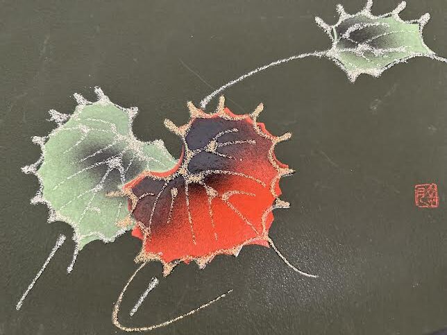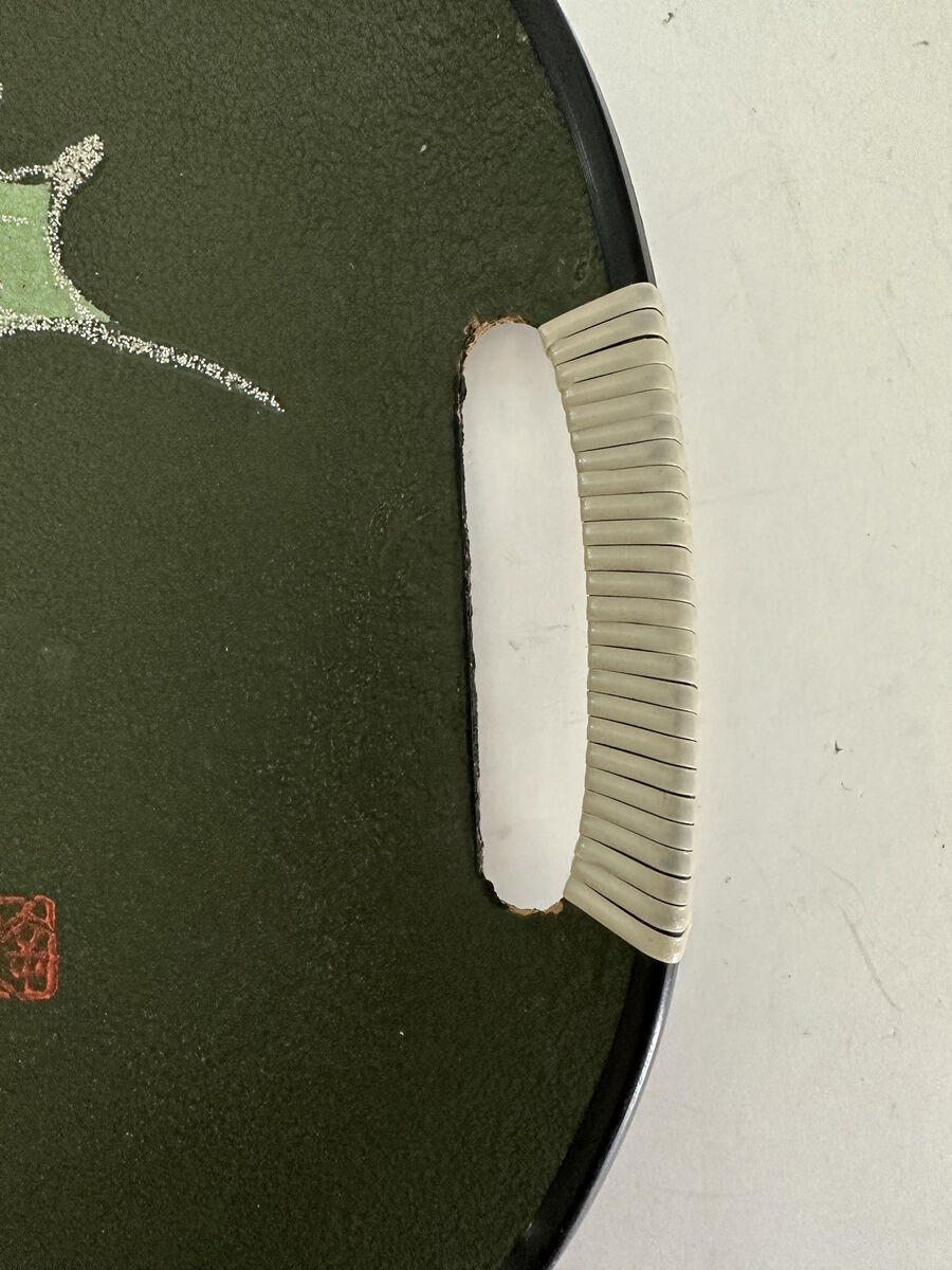 VenmoRossini Japan vintage fiberboard serving tray. Hand painted orange and green abstract leaf design on dark green background. Gold and silver glitter decorative accent on outlines. Excellent condition. No sign of wear or fading. Cream plastic twine handles. Curved rectangle with slight upward curve. Measures 17.5” x 11.5”. Some signs of wear on black reverse back. Weight 15.6 oz.