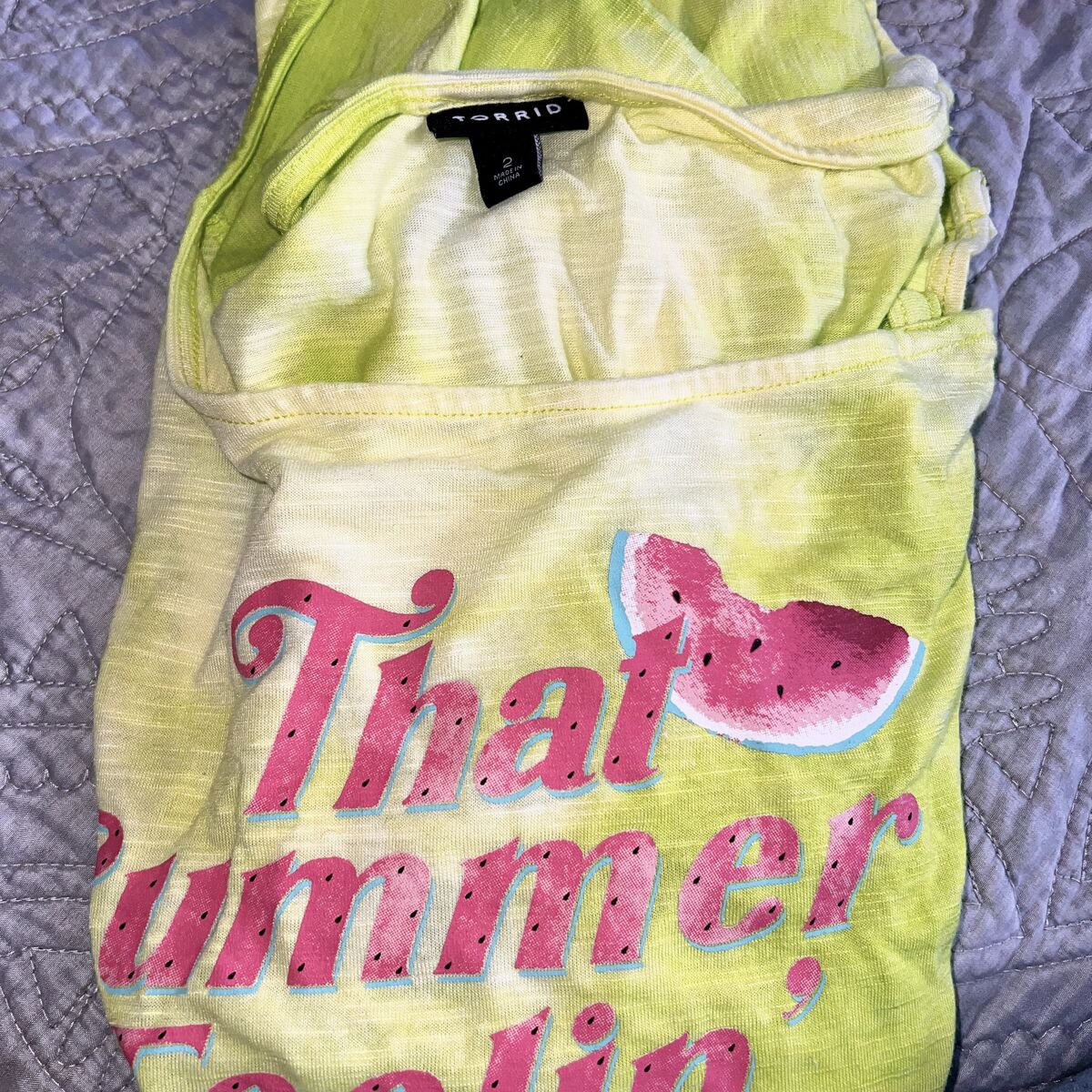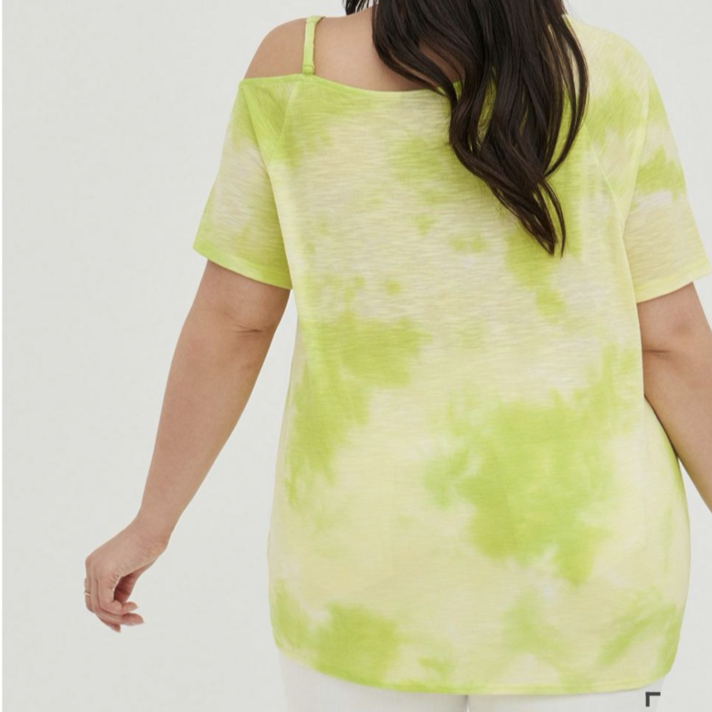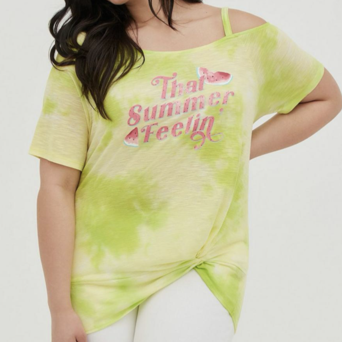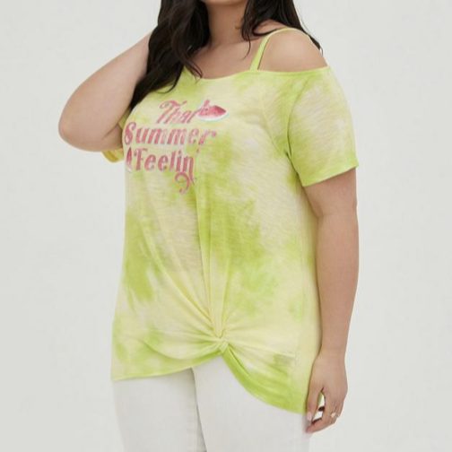 VenmoNew without tags. Feather soft knit fabric with an airy, worn in look and feel. Soft neon green with pink graphic "That Summer Feelin". Off the shoulder neckline, tie dye print. Max stretch level and very lightweight. 65% polyester 35% rayon. Tag price $45.50.