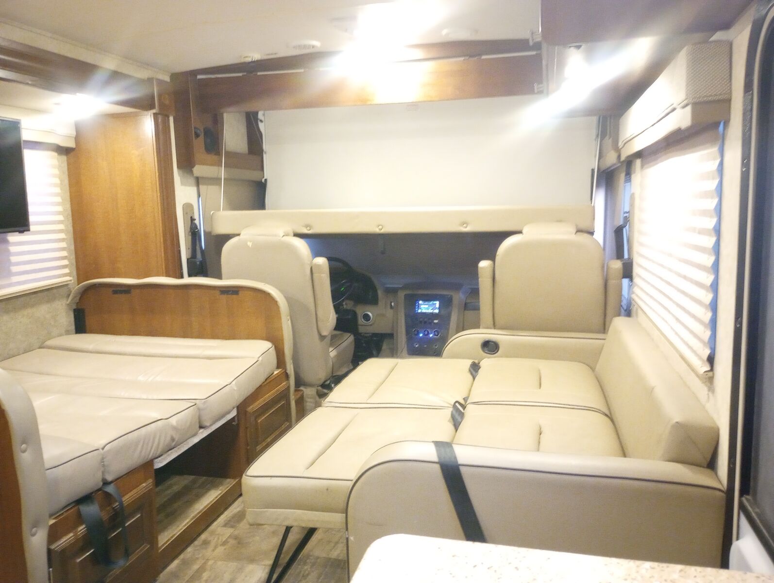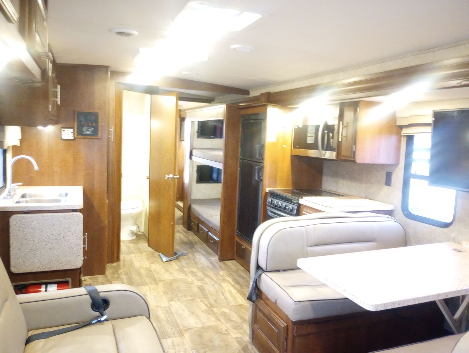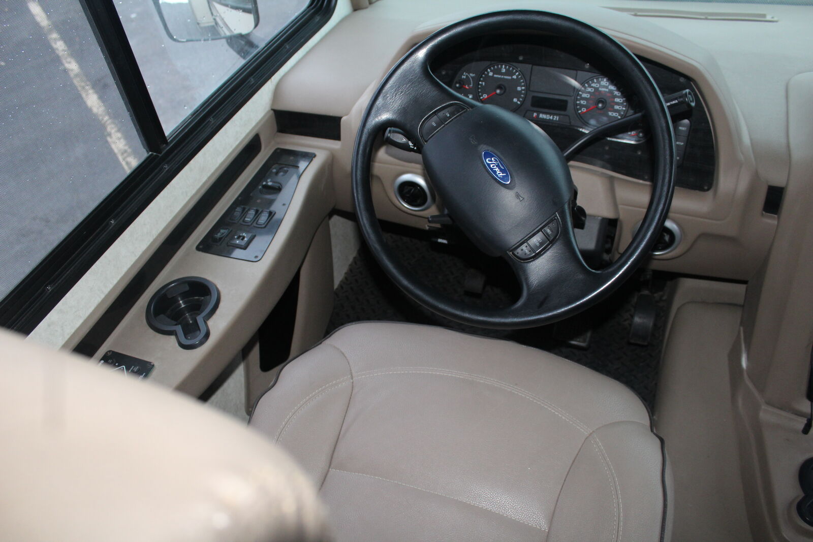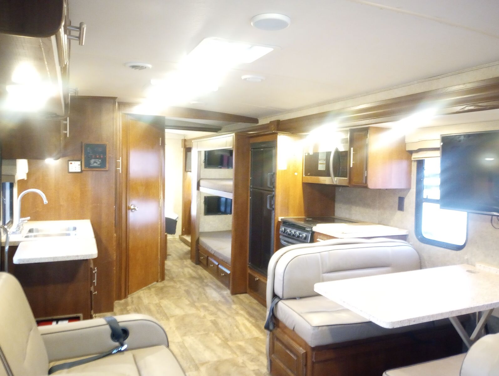 67828 miles. Ford F53 chassis with Triton v10 engine. Clean title, in hand. Sleeps 9 (queen bed with residential mattress, twin mattress bunk beds, dinette sleeper, jackknife sofa, and twin drop-down bunk above the cab). Seat belts for 6. This is a 30 amp unit (one ducted A/C unit).