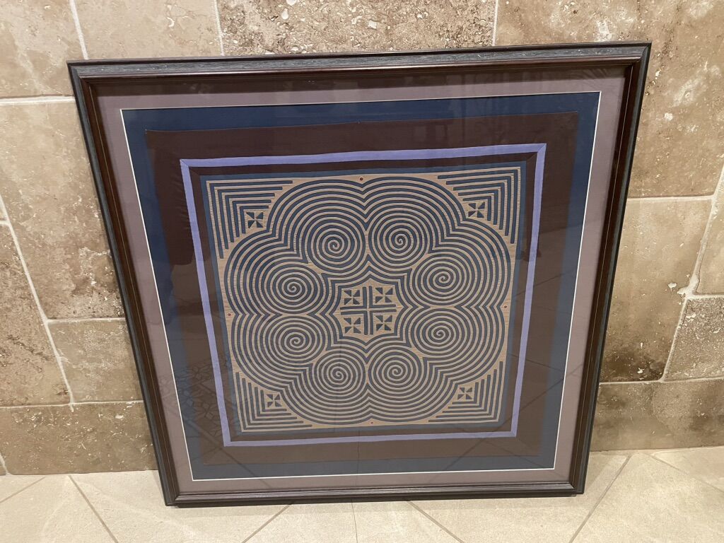I have a beautiful hand stitched Mola textile fabric art piece in a frame. It is mostly blue and off-white in a dark brown frame with mat boards. The frame is 34 1/2 inches square. It has picture wire on the back for hanging. It is from South America. The last 6 pictures are other artwork that I have listed on KSL. See my other ads for jewelry, artwork, home decor and more.