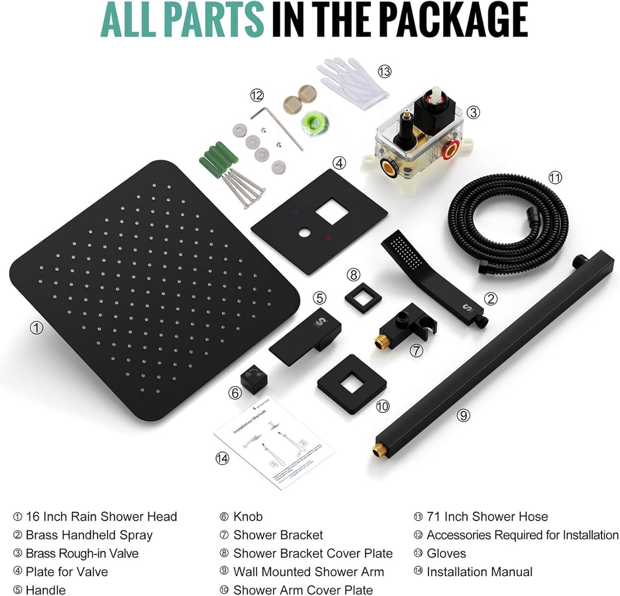 Complete Shower System Included: This shower faucet set includes everything you need for a luxurious upgrade: a 16-inch rain shower head, a handheld shower head, a 71-inch shower hose, a 16-inch shower arm, a handheld bracket, a mixing valve, a panel, a handle, a mode knob, shower arm and bracket covers, and all necessary installation accessories.