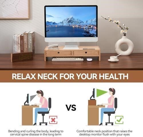 ERGONOMIC DESIGN :The ergonomic computer monitor stand (Measuring 4.92" in height) to keep your screen at a comfortable eye-level height, effectively improve posture to relieve eyestrain and prevent back & neck pain throughout the workdays.