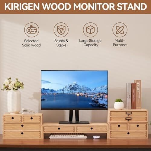 Retailer's title: KIRIGEN Wood Monitor Stand with 2 Drawers - Computer Arm Riser Desk Storage Organizer,Speaker TV Laptop Printer Stand with Pen Slot and Cable Management,2-Tier Desktop Shelf NA-2PMJ