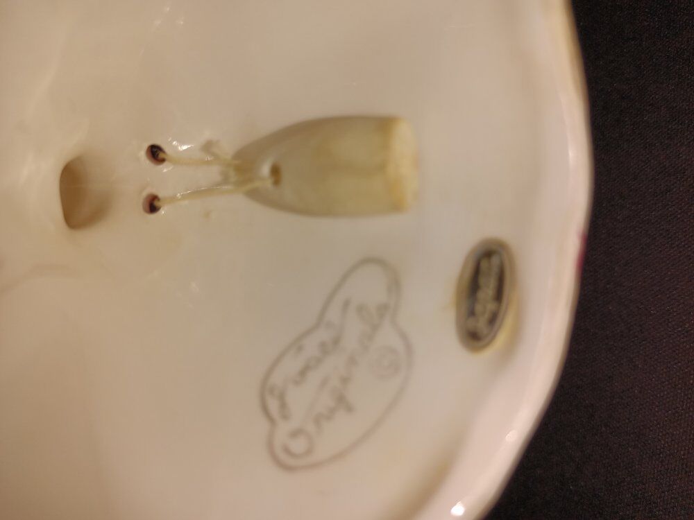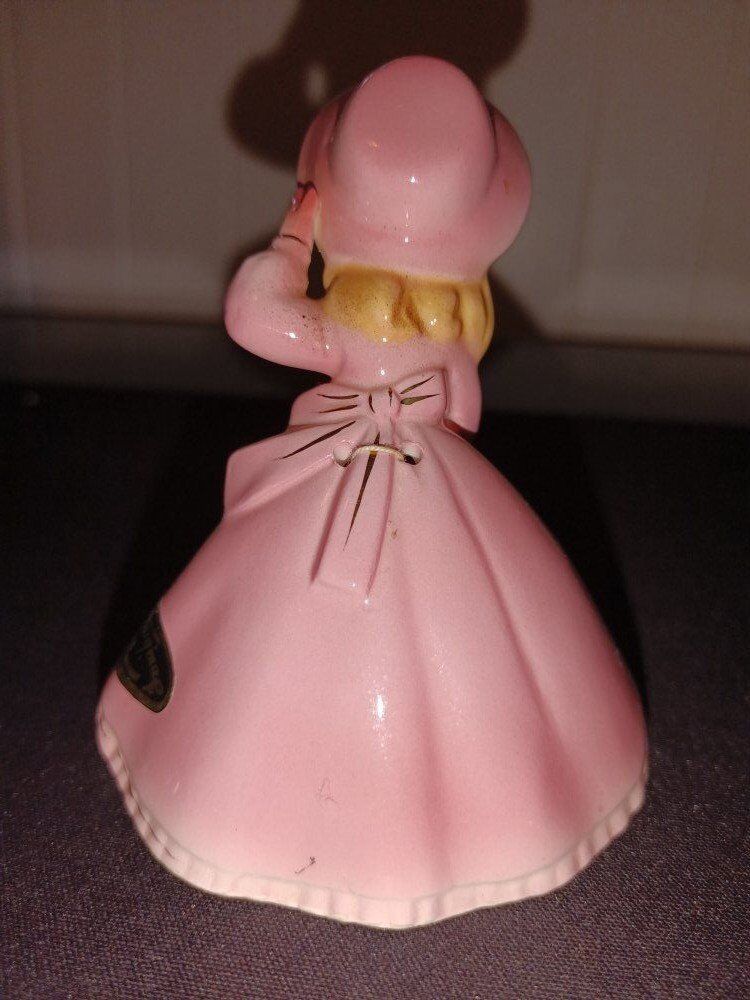 This piece features a girl in a pink dress with matching bonnet, adorned with blue and white flowers and gold trim. Porcelain with gold trim, made in Japan see sticker. Cash only. Local pick up only. OBO