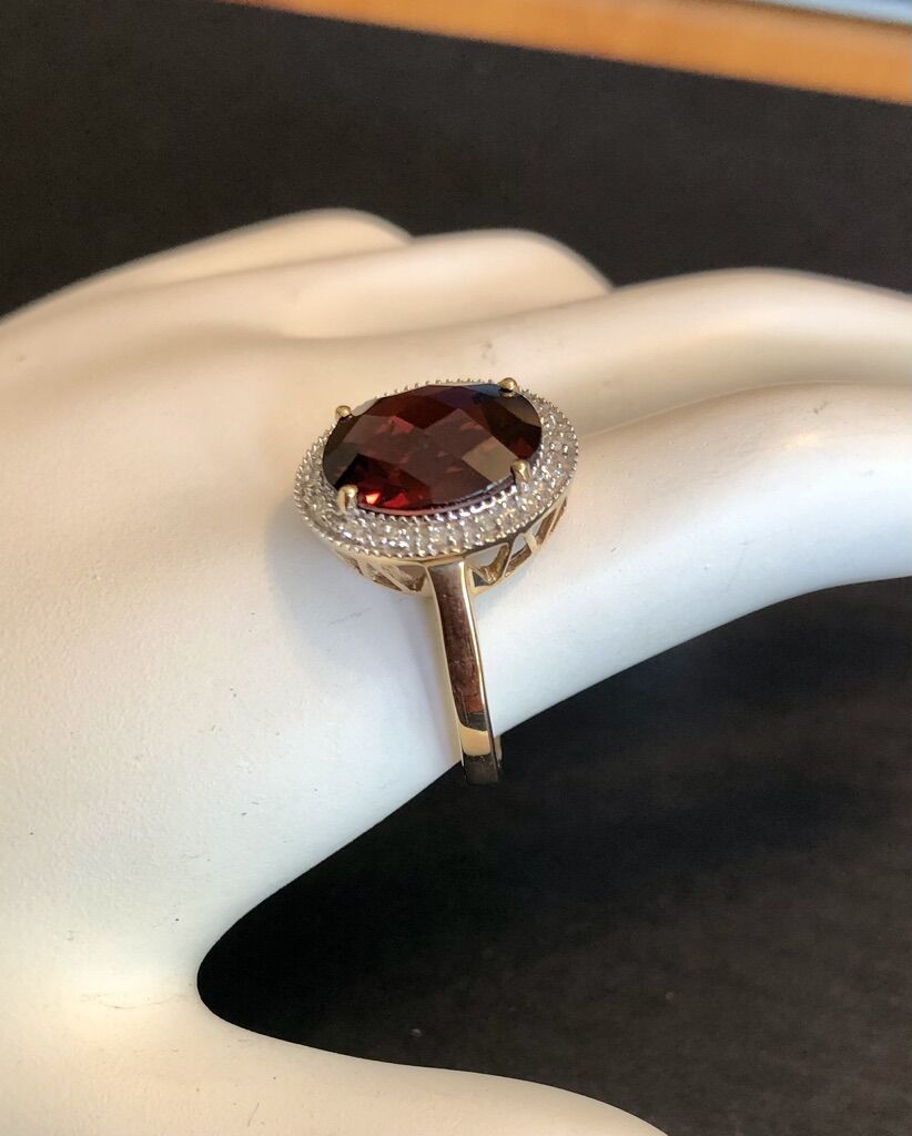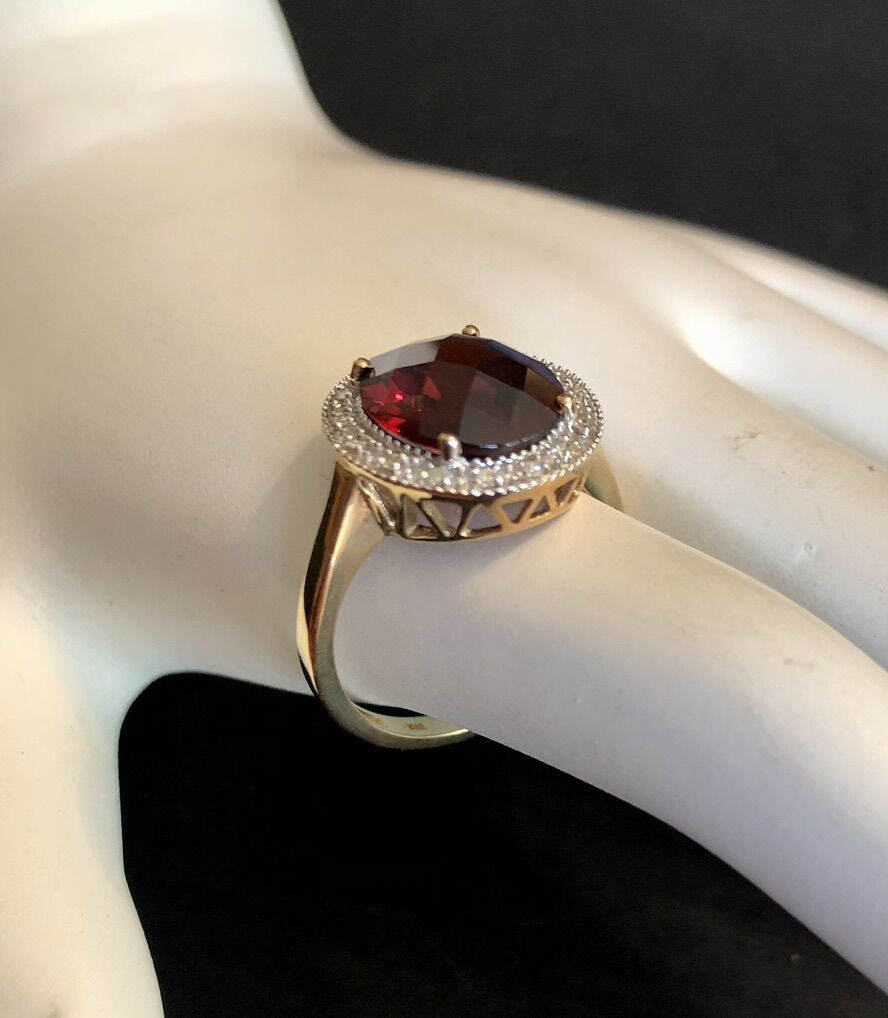 Elegant 10 K gold ring with checkerboard cut 4.9 Ct garnet and shimmering diamond accents. Size 7, new in box!