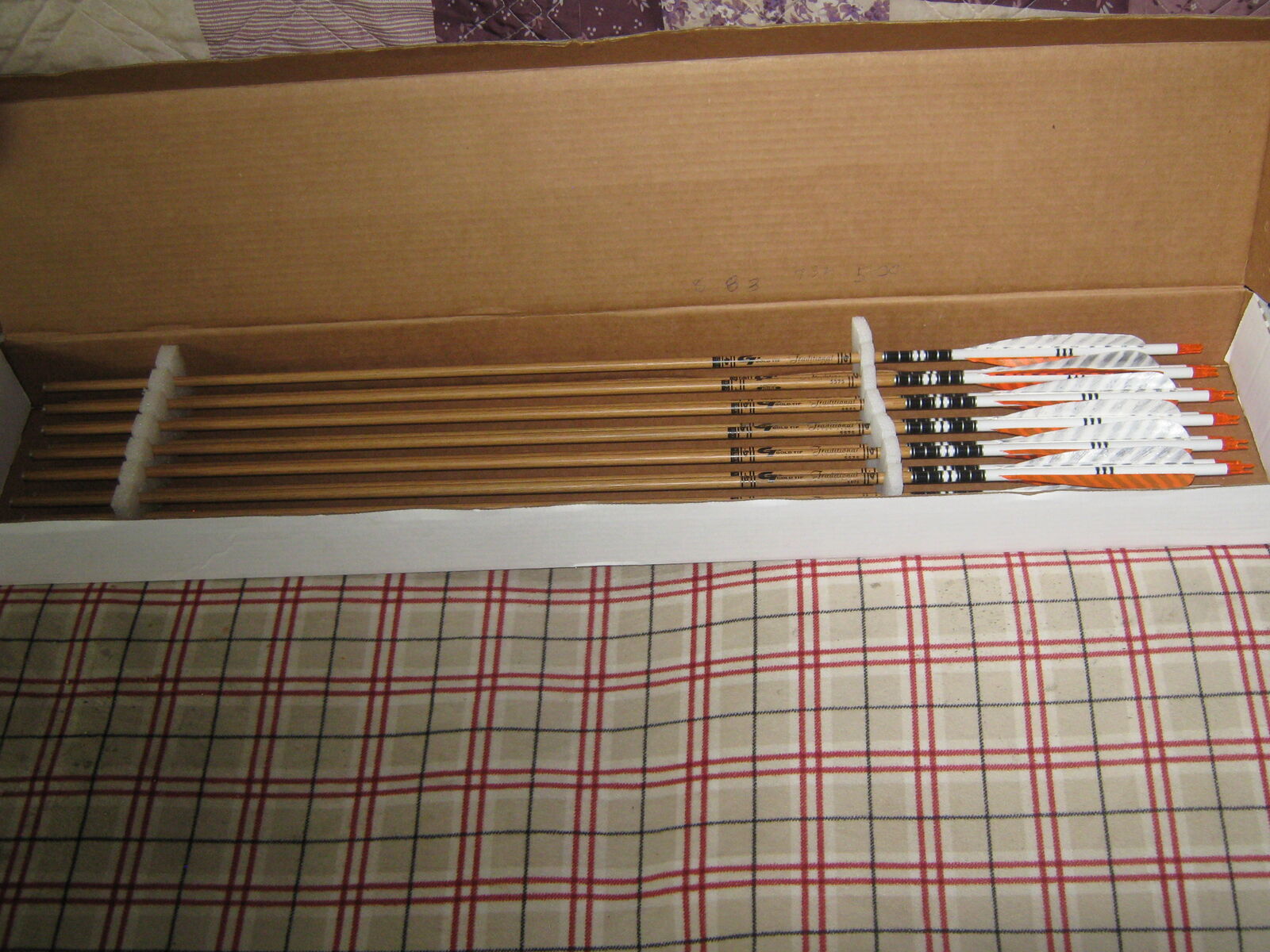One Dozen GoldTip 55 to 70 lb Wood Grain Traditonal Carbon Arrows 31 1/2 inches in length, from Valley of the Nock to insert. Feather Fletched.Custom Crested>NEW Never Been Shot.Great Arrows