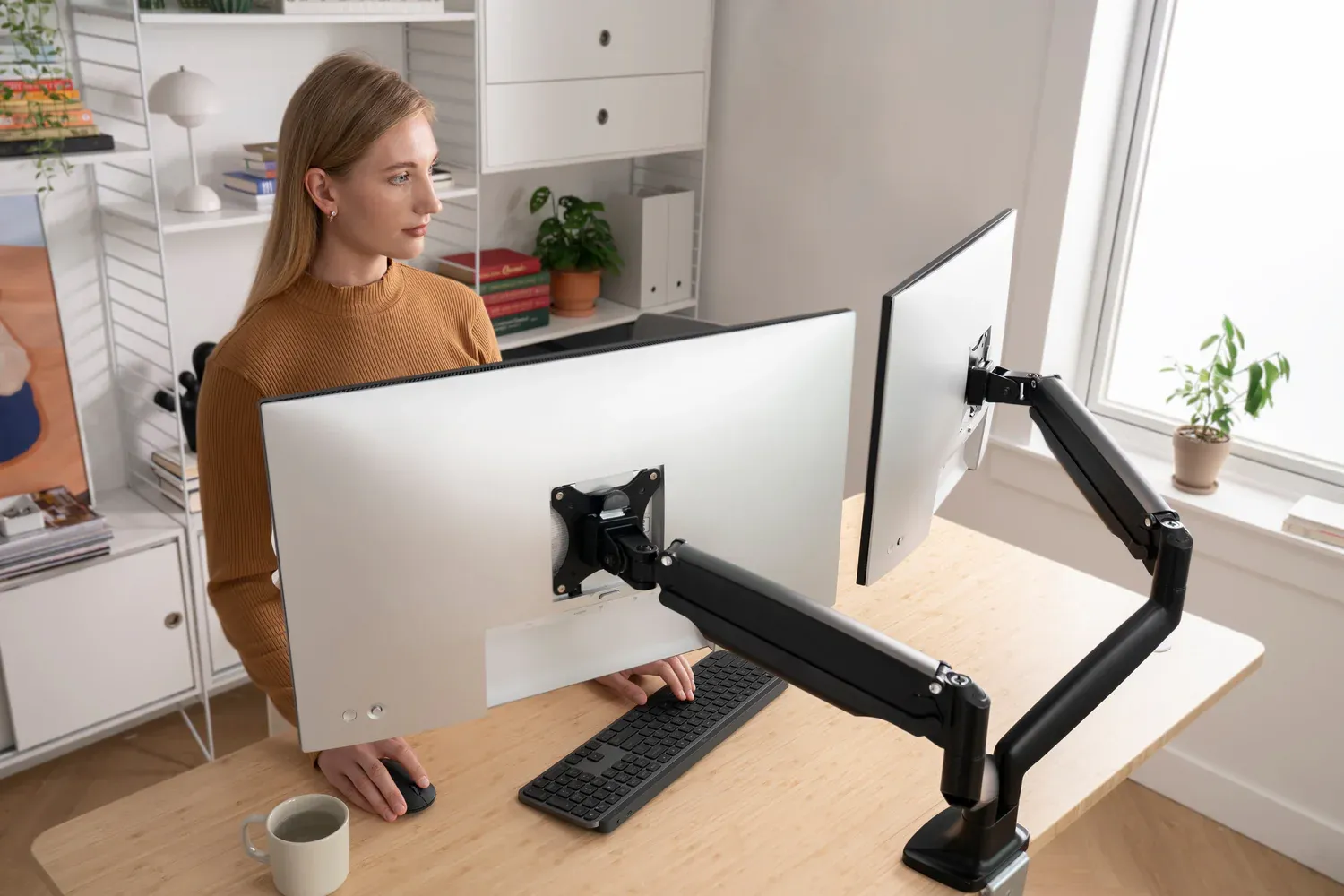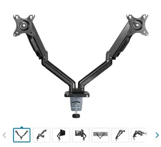 ZelleThis is a used but perfect mount for two computer monitors that attaches to the edge of your desk so that your monitors use no desk space. Very flexible as it can handle up to a 32 inch monitor, who has such a thing, but still have them setting next to each other. Pretty much every computer now can handle two monitors without anything more than an additional cable. I have several nice monitors if you would like to add a second one to your system, call and we can discuss. Due to weight and shape this is not shipable. Thanks.