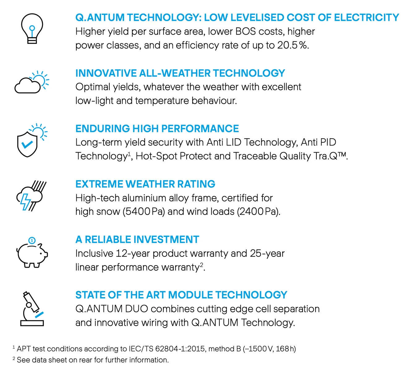 Q.ANTUM’s world-record-holding cell concept has now been combined with state-of-the-art circuitry half cells and a six-busbar design, thus achieving outstanding performance under real conditions – both with low-intensity solar radiation as well as on hot, clear summer days.