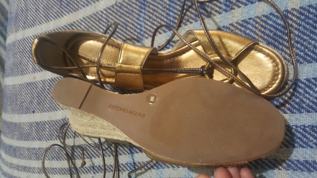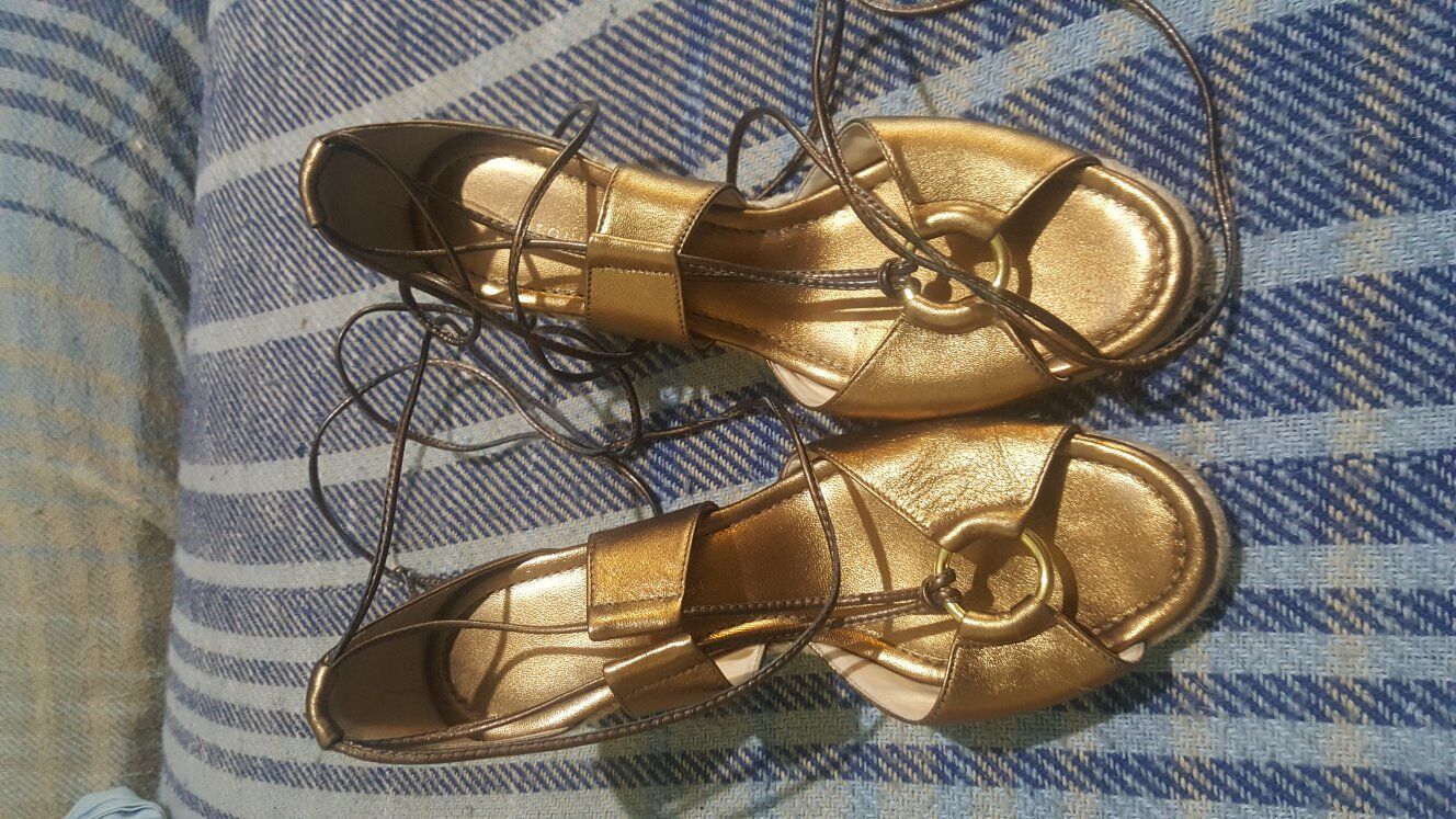 Stylish gold wedge sandals with lace-up design.