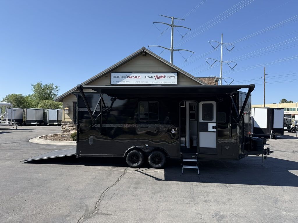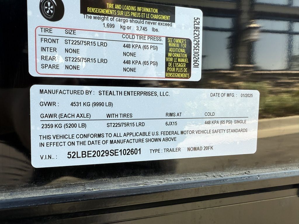 LIMITED TIME $465 A MONTH WITH ZERO DOWN WITH OUR SPECIAL LOCAL CREDIT UNION PARTNER!!! NO PRE-PAYMENT PENALTIES!!! !! NEW NOMAD 20FK MODEL!!! WILL FIT ANY STOCK SIDE BY SIDE UTV!!! 10,400# GVWR/5.2k AXLES!!! FULLY INSULATED!!! HEATING AND A/C!!! STEREO!!! 7FT-6" Interior Height/ 36" Wedge Front 2x6 Tube Steel Main Rails 16" O/C Floor Tube Crossmembers 16" O/C Steel Tube Wall Studs 24" O/C Tube Steel Roof Bows 18" Extended Triple Tube A-Frame Lippert Torsion Axles w/32 Deg Down Start Angle 5200# Axles w/ST235/80R16 Tires (TA4 40" Spread Axles Electric Brakes 2-5/16 Adjustable A-Frame Coupler 5000# Electric A-Frame Tongue Jack 4000# Rear Cableless Ramp Door w/Steel Flap (2) Roof Vent in Living/Garage Area (1) Prep & Wired for A/C - Main A/C only 12V Roof Vent in Bathroom Painted Tongue/Rear Sill Black (1) Pair Rear Stab Jacks Rear Flare w/(2) 12V Loading Lights 48" Beavertail ****PLUMBING**** 46 Gallon Fresh Water Tank (2) 43 Gallon Waste Holding Tank Sewer Hose Storage Compartment Double 20# LP Bottle w/Cover on A-Frame 6 Gallon DSI LP Gas/Electric Water Heater 12V Water Pump City/Gravity Water Fill Hook Up Outside Shower and RV Toilet Bathroom Mirror & Robe Hooks 24x36 Shower w/Shower Curtain & Surround Drop-In Cook Top Large Single Bowl Kitchen Sink Tank and Battery Monitor Panel ****ELECTRICAL**** 7-Way Electrical Plug LED Strip Taillights/Marker Lights 12V Deluxe LED Lighting 45 Amp RV Power Center w/12V Converter 30 Amp Motor base Plug Detachable Twist lock Power Cord Battery Box Only (Battery not included) 110V GFI Receptacle in Kitchen Area (2) 110V Receptacles in Garage Area Dual USB Ports in Kitchen 6 Cubic Foot Refrigerator Microwave Oven 35K BTU Furnace 110V Exterior GFI Receptacle TV Prep Package - Includes: Coax Cable Outlets - Interior & Exterior Omnidirectional TV Antenna UHF/VHF 110V 4FT LED Cove Lights in Living/Garage Area Smoke, CO, & LP Detector & Fire Extinguisher *****INTERIOR***** 3/4" Drymax Floor & 3/8" Wht Vinyl Walls Ploystyrene Foam Insulation-Walls & Ceiling ATP Rubber Floor Covering White Vinyl Ceiling Liner w/Black Cove Molding Black Kitchen L-Base Cabinet w/Laminate C-Top Black Kitchen L-Overhead Cabinet (4) 5000# Recessed D-Rings Large Front Storage Area w/Shelf (1) Pair Black Aluminum Directional Vents ****ROOF**** Seamless Aluminum Flat Top Roof LED Marker Lights Rear Flare w/(2) 12V Loading Lights *****METAL**** .080 Screwless Armor Shield Composite Skin STD Colors:Crystal White, Black, Matte Black Windstar Silver, Victory Red, Pewter, Charcoal 3" Heavy Duty Flat Top Trim 3" Flat Bottom Trim & 6" Barrier Tape All Black Exterior Trim & ATP Fenders 24" Tall Slanted Diamond Plate Stoneguard 24" Tall Diamond Plate along sides at bottom (1) Pair Black Aluminum Directional Vents *****DOORS & WINDOWS**** 26W x 78H Radius Corner Deluxe RV Door w/Window & Screen Aluminum Door Holdback Double Fold Out RV Step 4000# Rear Cableless Ramp Door w/Steel Flap All Black Zinc Coated Door Hardware 24Wx72H Door w/Barlock in Front Storage 30x15 Window in Kitchen Area 30x30 Window in Living/Garage Area 30x22 Egress Window in Living/Garage Area Window Coverings - In Garage Area (Only) ****FINAL***** LED Strip Tailights/Marker Lights 12V Deluxe LED Lightning Black Aluminum Wheels w/Radial Tires & Black Center Caps Recessed Spare Tire Compartment Limited 3 Year Structural Warranty 01-OPT1.952 Platinum Package Includes: Deluxe Stereo Package with: AM/FM/CD/DVD/USB/MP3/WMA Capable Stereo, (4) Hi Output Weatherproof Speakers (2) Interior & (2) Exterior 43" TV w/swivel bracket Rear Hide-A-Screen Solar Port, Stow and Go Bed Lift System: (Includes (1) Queen Mattress Setup) 7SE102601
