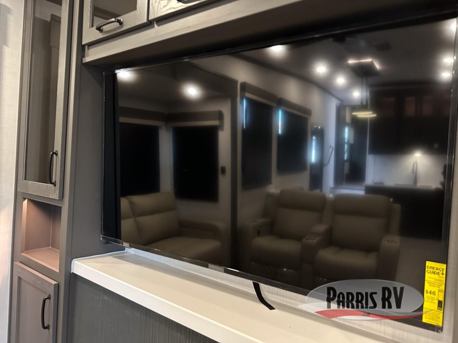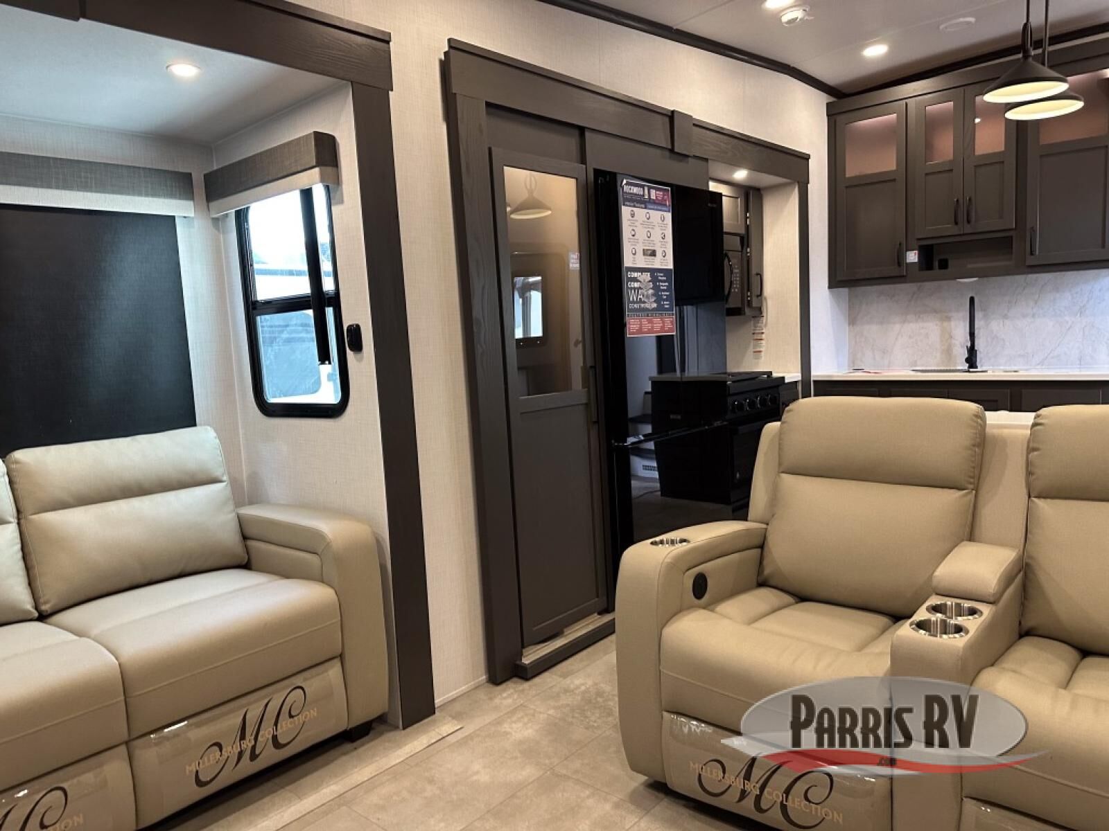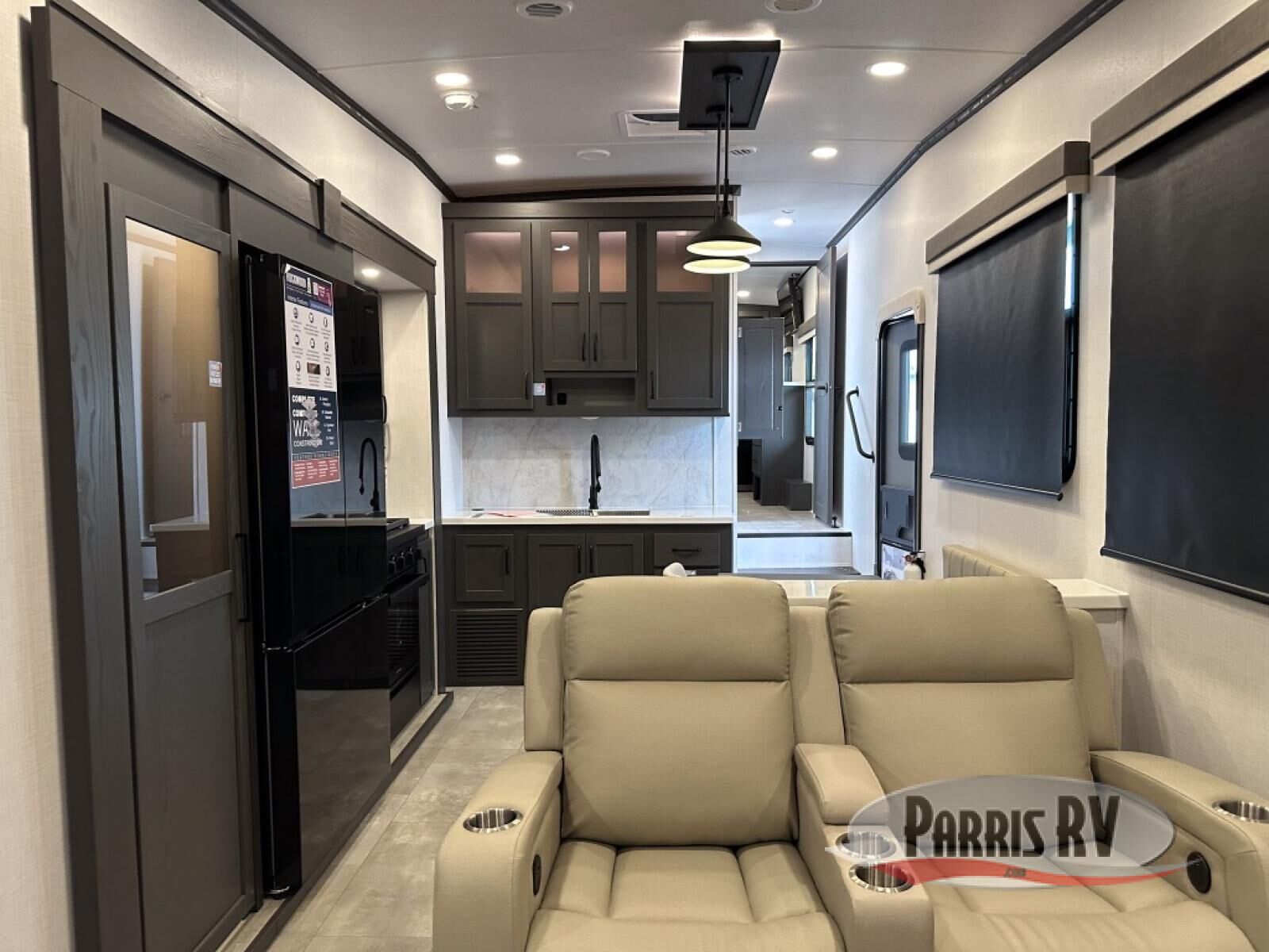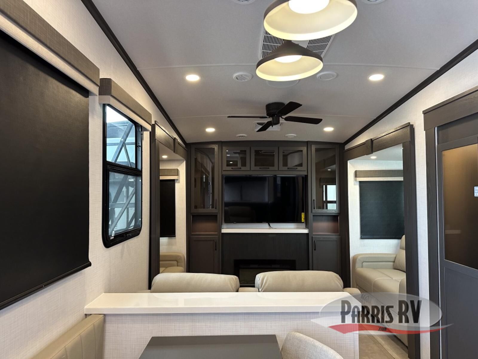 Looking for a fifth wheel to entertain other RVers while at the campgrounds? This is the one that offers seating for up to 10 between the dual opposing hide-a-bed sofa slides and the theater seating in the rear living area. There is a full wall entertainment center here, along with a Smart TV and a fireplace, plus a table with chairs and a bench in the middle kitchen. The cook will have full amenities to keep everyone fed including a 12V refrigerator and a pantry to store lots of food. The full bathroom includes linen storage and a shower with a seat, and the front bedroom offers a slide out queen bed or choose a king option, a dresser and a front wardrobe including shelves. There is even washer and dryer prep if you choose to go full-time!