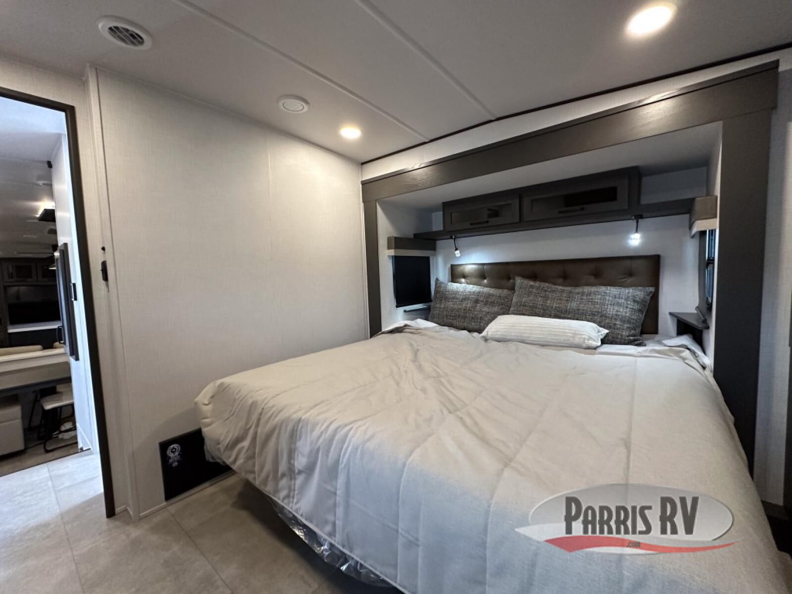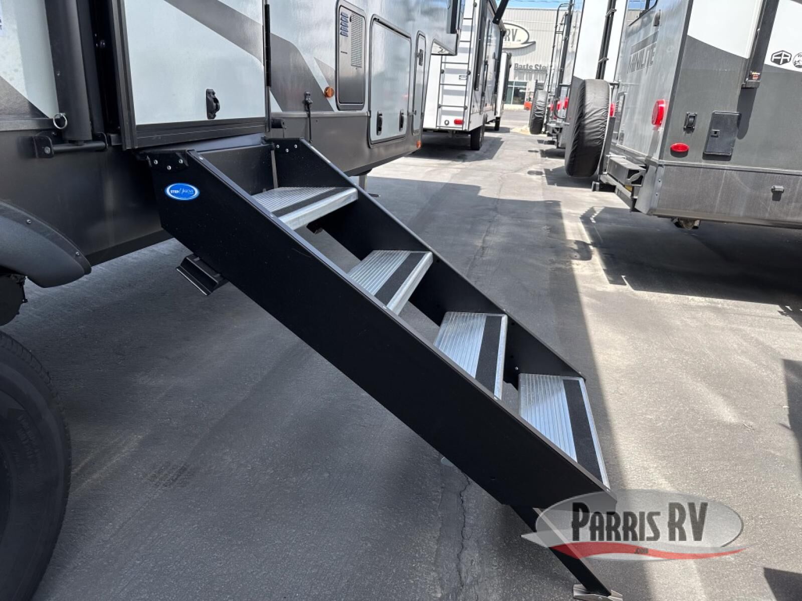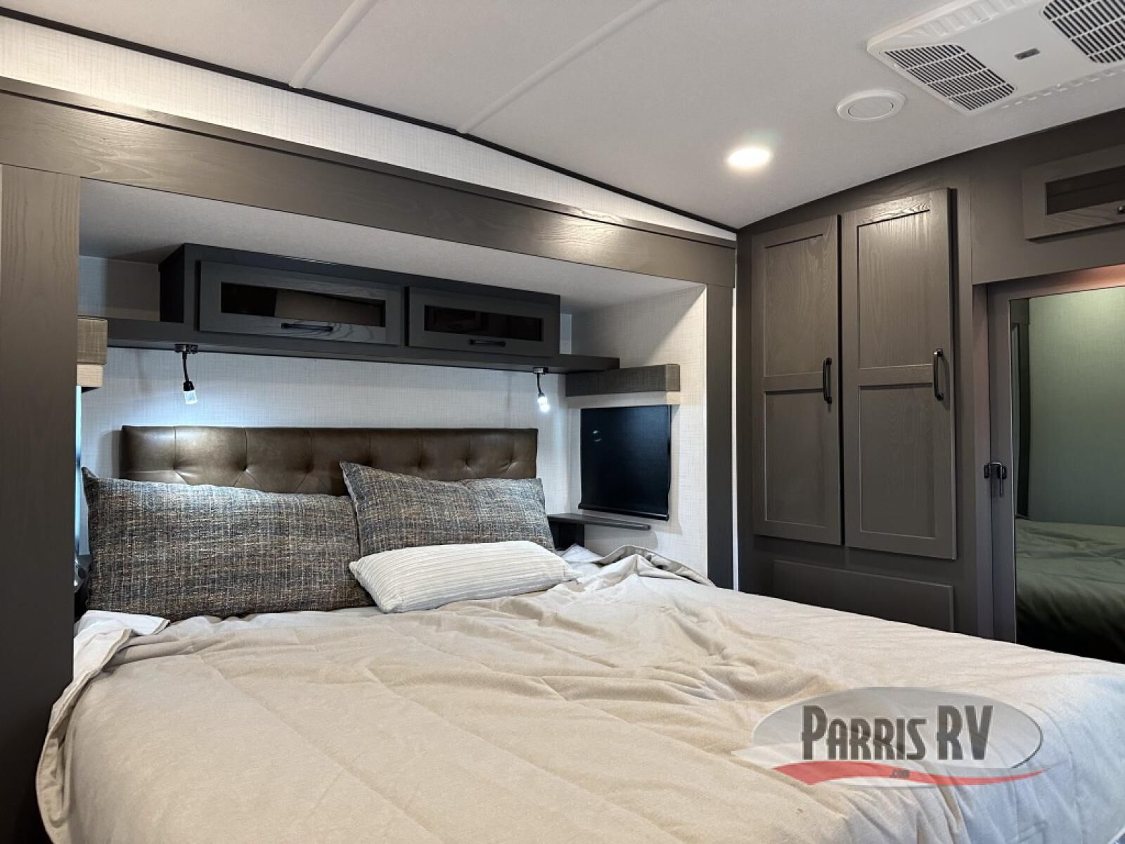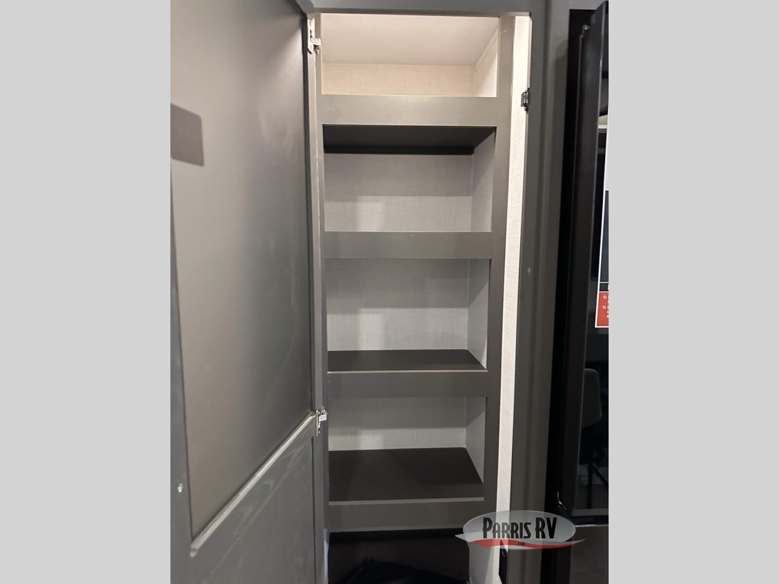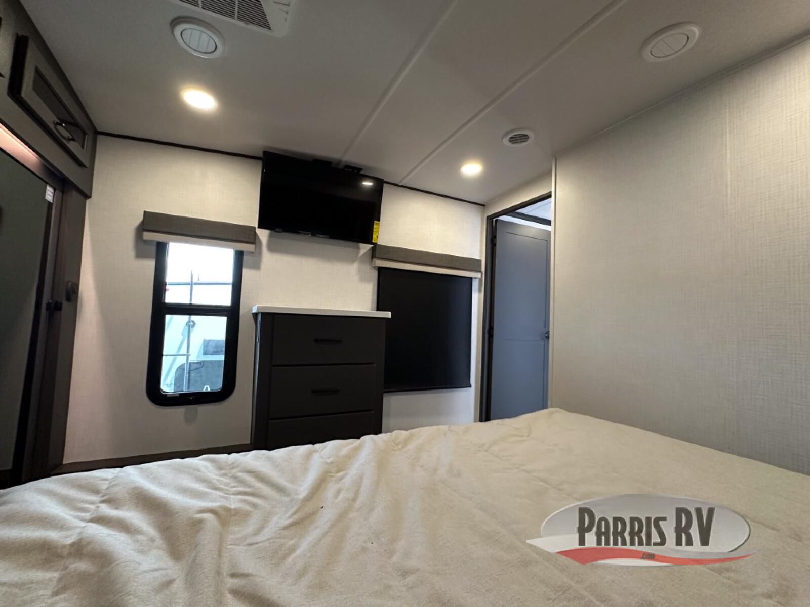 Looking for a fifth wheel to entertain other RVers while at the campgrounds? This is the one that offers seating for up to 10 between the dual opposing hide-a-bed sofa slides and the theater seating in the rear living area. There is a full wall entertainment center here, along with a Smart TV and a fireplace, plus a table with chairs and a bench in the middle kitchen. The cook will have full amenities to keep everyone fed including a 12V refrigerator and a pantry to store lots of food. The full bathroom includes linen storage and a shower with a seat, and the front bedroom offers a slide out queen bed or choose a king option, a dresser and a front wardrobe including shelves. There is even washer and dryer prep if you choose to go full-time!