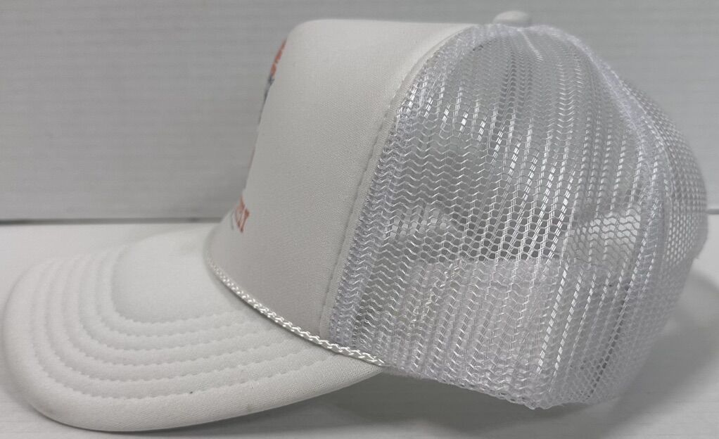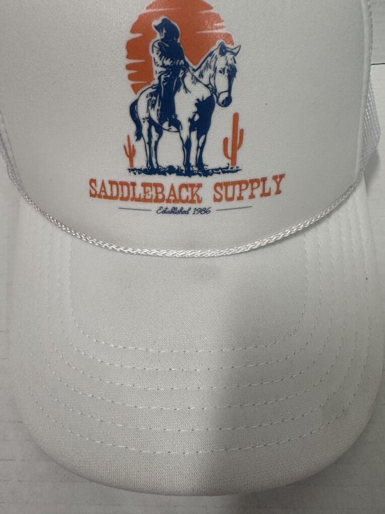 Hat is pre-owned, please review picture provided of a mark on the brim of the hat. The saddleback Supply Wild & Free White Rope Trucker Style Snapback by Otto is a versatile and stylish hat suitable for various occasions. Made of polyester and foam, this vintage-inspired hat features a solid white color with a mesh back for breathability and an adjustable snapback closure for a comfortable fit. The hat is inspired by Western, hunting, cowboy, and outdoor themes, making it a classic and retro addition to any wardrobe for all seasons.