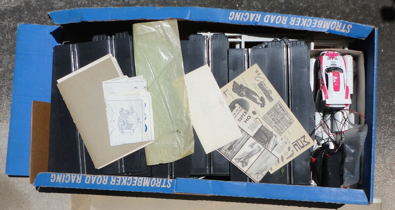 I got this as part of a large slot car lot, and have no way to test it. See pictures for what is included. The porsche car included works (tested with a battery) - but it is a much newer car than the track. The bax is in poor condition.