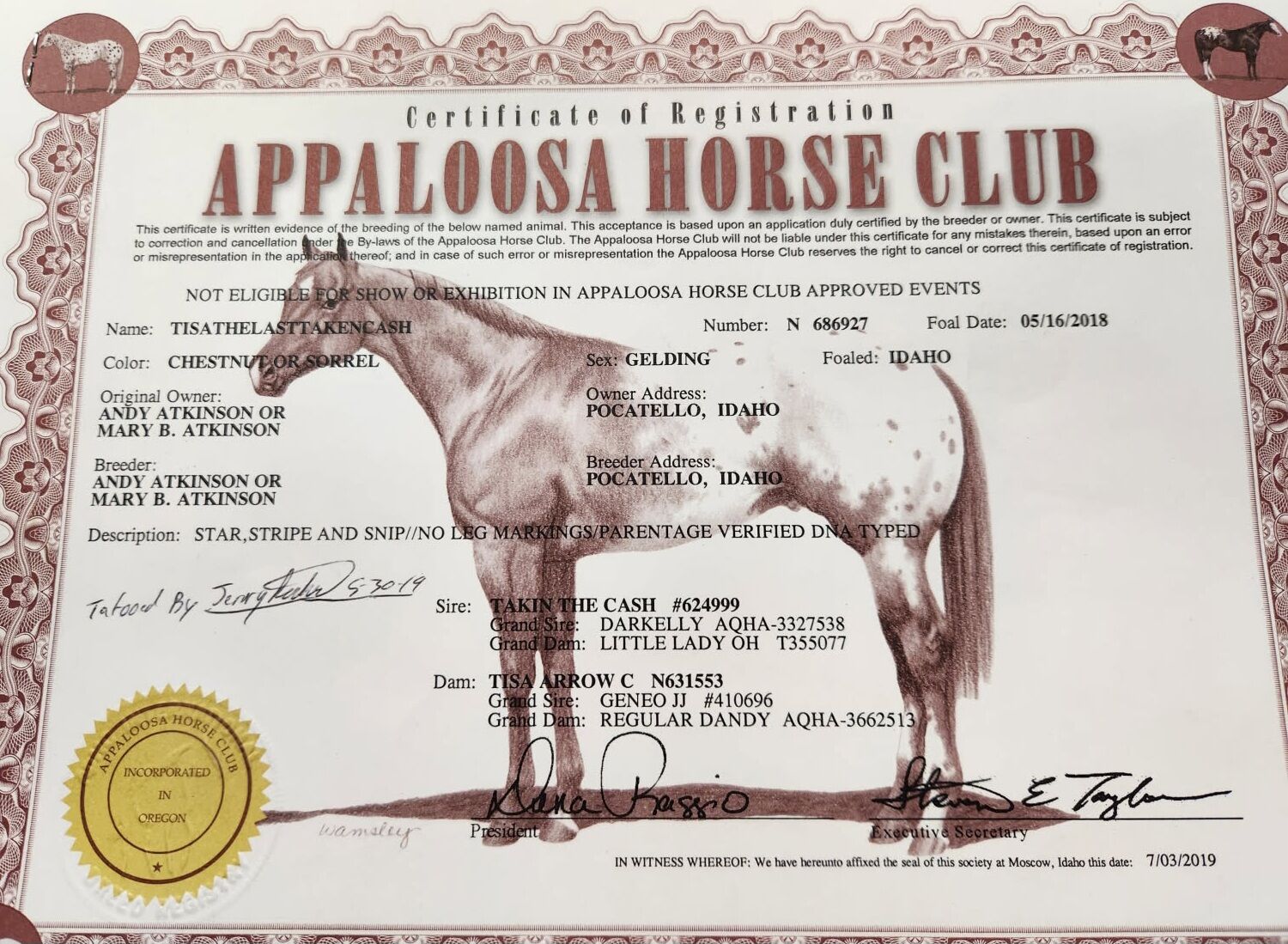 Gelding #2 with No white socks is registered Appaloosa registered name is TISATHELASTTAKENCASH (we just call him Brother) he is 7 years old, well-mannered and fast.